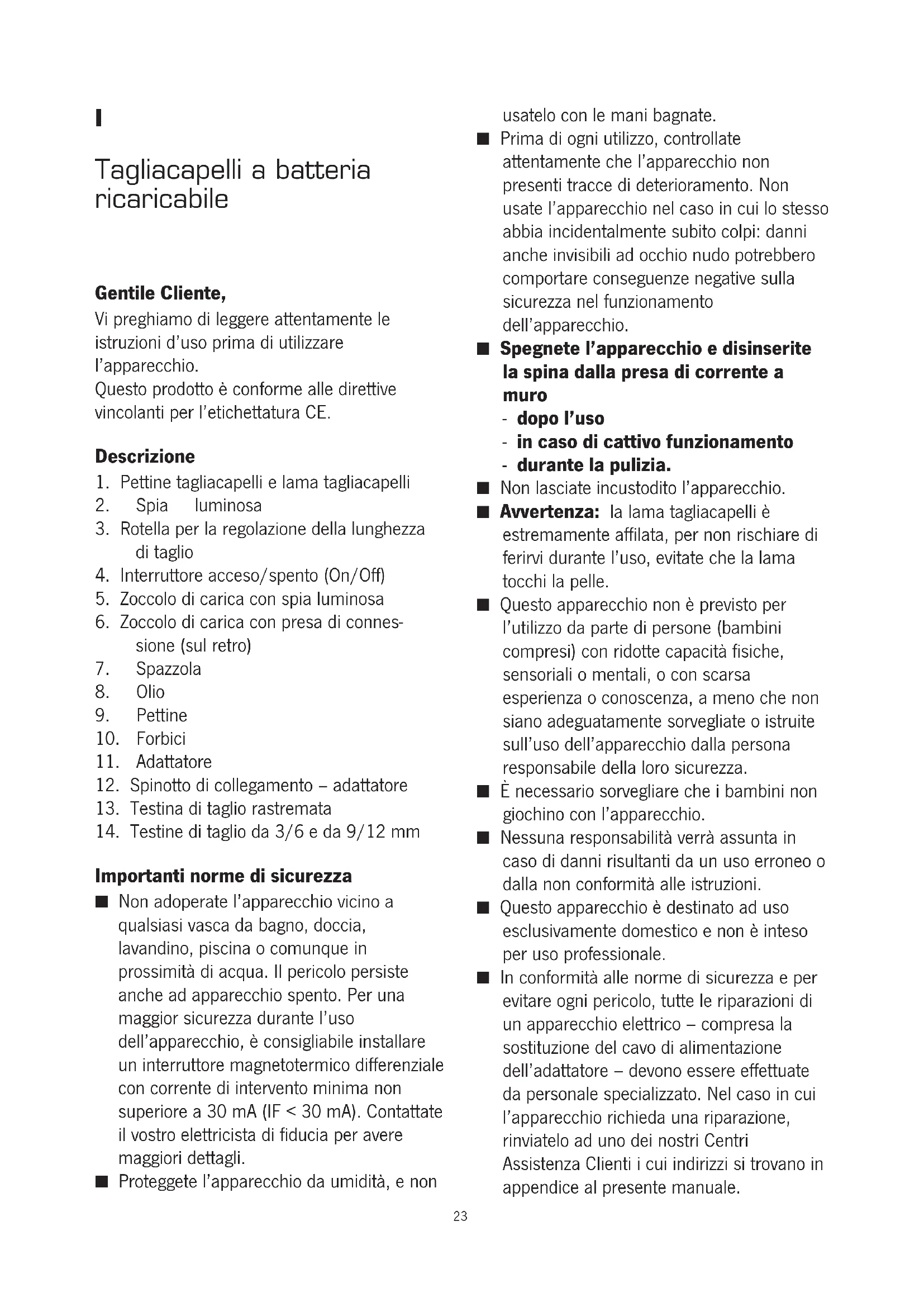 Importanti norme di sicurezza ■ Non adoperate l’apparecchio vicino a qualsiasi vasca da bagno, doccia, lavandino, piscina o comunque in prossimità di acqua. Il pericolo persiste anche ad apparecchio spento. Per una maggior sicurezza durante l’uso dell’apparecchio, è consigliabile installare un interruttore magnetotermico differenziale con corrente di intervento minima non superiore a 30 mA (IF < 30 mA). Contattate il vostro elettricista di fiducia per avere maggiori dettagli. ■ Proteggete l’apparecchio da umidità, e non usatelo con le mani bagnate. ■ Prima di ogni utilizzo, controllate attentamente che l’apparecchio non presenti tracce di deterioramento. Non usate l’apparecchio nel caso in cui lo stesso abbia incidentalmente subito colpi: danni anche invisibili ad occhio nudo potrebbero comportare conseguenze negative sulla sicurezza nel funzionamento dell’apparecchio. ■ Spegnete l’apparecchio e disinserite la spina dalla presa di corrente a muro - dopo l’uso - in caso di cattivo funzionamento - durante la pulizia. ■ Non lasciate incustodito l’apparecchio. ■ Avvertenza: la lama tagliacapelli è estremamente affilata, per non rischiare di ferirvi durante l’uso, evitate che la lama tocchi la pelle. ■ Questo apparecchio non è previsto per l’utilizzo da parte di persone (bambini compresi) con ridotte capacità fisiche, sensoriali o mentali, o con scarsa esperienza o conoscenza, a meno che non siano adeguatamente sorvegliate o istruite sull’uso dell’apparecchio dalla persona responsabile della loro sicurezza. ■ È necessario sorvegliare che i bambini non giochino con l’apparecchio. ■ Nessuna responsabilità verrà assunta in caso di danni risultanti da un uso erroneo o dalla non conformità alle istruzioni. ■ Questo apparecchio è destinato ad uso esclusivamente domestico e non è inteso per uso professionale. ■ In conformità alle norme di sicurezza e per evitare ogni pericolo, tutte le riparazioni di un apparecchio elettrico – compresa la sostituzione del cavo di alimentazione dell’adattatore – devono essere effettuate da personale specializzato. Nel caso in cui l’apparecchio richieda una riparazione, rinviatelo ad uno dei nostri Centri Assistenza Clienti i cui indirizzi si trovano in appendice al presente manuale. 23Collegamento alla rete Assicuratevi che la tensione d’alimentazione corrisponda alla tensione indicata sulla targhetta portadati dell’adattatore. Il processo di carica Per il primo utilizzo del tagliacapelli, occorre mettere in carica la batteria per circa un’ora. Ma un periodo più lungo di carica non comporta nessun danno o pericolo per l’apparecchio. Se notate una considerevole diminuzione della capacità di taglio, o se la spia luminosa diventa rossa, spegnete l’apparecchio e mettete in ricarica la batteria.