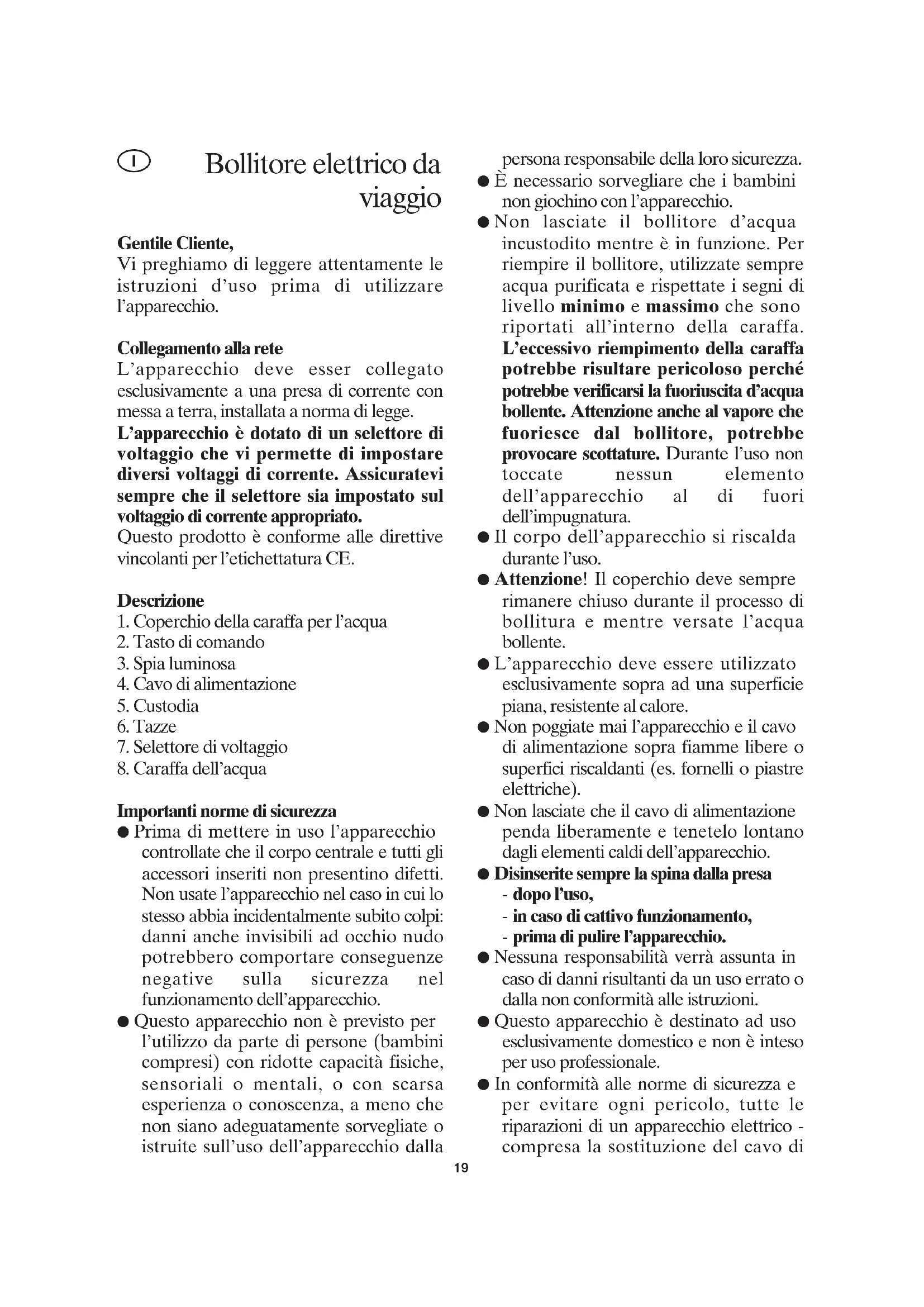 Bollitore elettrico da viaggio alimentazione – devono essere effettuate da personale specializzato. Nel caso in cui l’apparecchio richieda una riparazione, rinviatelo ad uno dei nostri Centri Assistenza Clienti i cui indirizzi si trovano in appendice al presente manuale. Interruzione termica automatica Il dispositivo di interruzione automatica preregolata protegge l’elemento riscaldante contro il surriscaldamento nel caso in cui l’apparecchio venga acceso senza averci aggiunto dell’acqua all’interno o l’elemento riscaldante presenti dei depositi di calcare. Una volta spento tramite il dispositivo di interruzione automatica, il bollitore, prima di esser riacceso, dovrà avere il tempo di raffreddarsi o si dovranno rimuovere i depositi di calcare. Prima di adoperare l’apparecchio per la prima volta ● Per una maggiore garanzia di pulizia al primo utilizzo dell’apparecchio, eseguite un ciclo completo di bollitura e eliminate completamente l’acqua. Processo di bollitura dell’acqua