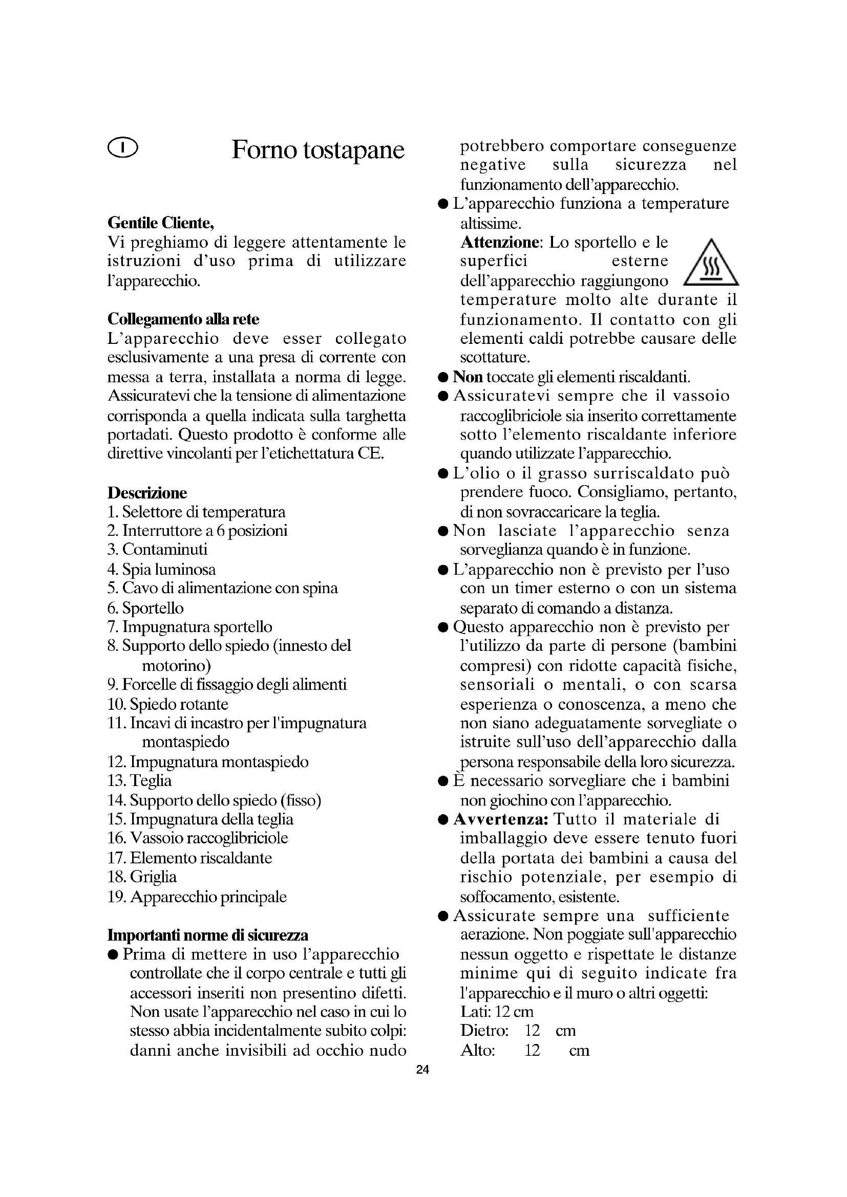 Importanti norme di sicurezza ● Prima di mettere in uso l’apparecchio controllate che il corpo centrale e tutti gli accessori inseriti non presentino difetti. Non usate l’apparecchio nel caso in cui lo stesso abbia incidentalmente subito colpi: danni anche invisibili ad occhio nudo potrebbero comportare conseguenze negative sulla sicurezza nel funzionamento dell’apparecchio. ● L’apparecchio funziona a temperature altissime. Attenzione: Lo sportello e le superfici esterne dell’apparecchio raggiungono temperature molto alte durante il funzionamento. Il contatto con gli elementi caldi potrebbe causare delle scottature. ● Non toccate gli elementi riscaldanti. ● Assicuratevi sempre che il vassoio raccoglibriciole sia inserito correttamente sotto l’elemento riscaldante inferiore quando utilizzate l’apparecchio. ● L’olio o il grasso surriscaldato può prendere fuoco. Consigliamo, pertanto, di non sovraccaricare la teglia. ● Non lasciate l’apparecchio senza sorveglianza quando è in funzione. ● L’apparecchio non è previsto per l’uso con un timer esterno o con un sistema separato di comando a distanza. ● Questo apparecchio non è previsto per l’utilizzo da parte di persone (bambini compresi) con ridotte capacità fisiche, sensoriali o mentali, o con scarsa esperienza o conoscenza, a meno che non siano adeguatamente sorvegliate o istruite sull’uso dell’apparecchio dalla persona responsabile della loro sicurezza. ● È necessario sorvegliare che i bambini non giochino con l’apparecchio. ● Avvertenza: Tutto il materiale di imballaggio deve essere tenuto fuori della portata dei bambini a causa del rischio potenziale, per esempio di soffocamento, esistente. ● Assicurate sempre una sufficiente aerazione. Non poggiate sull'apparecchio nessun oggetto e rispettate le distanze minime qui di seguito indicate fra l'apparecchio e il muro o altri oggetti: Lati: 12 cm Dietro: 12 cm Alto: 12 cm