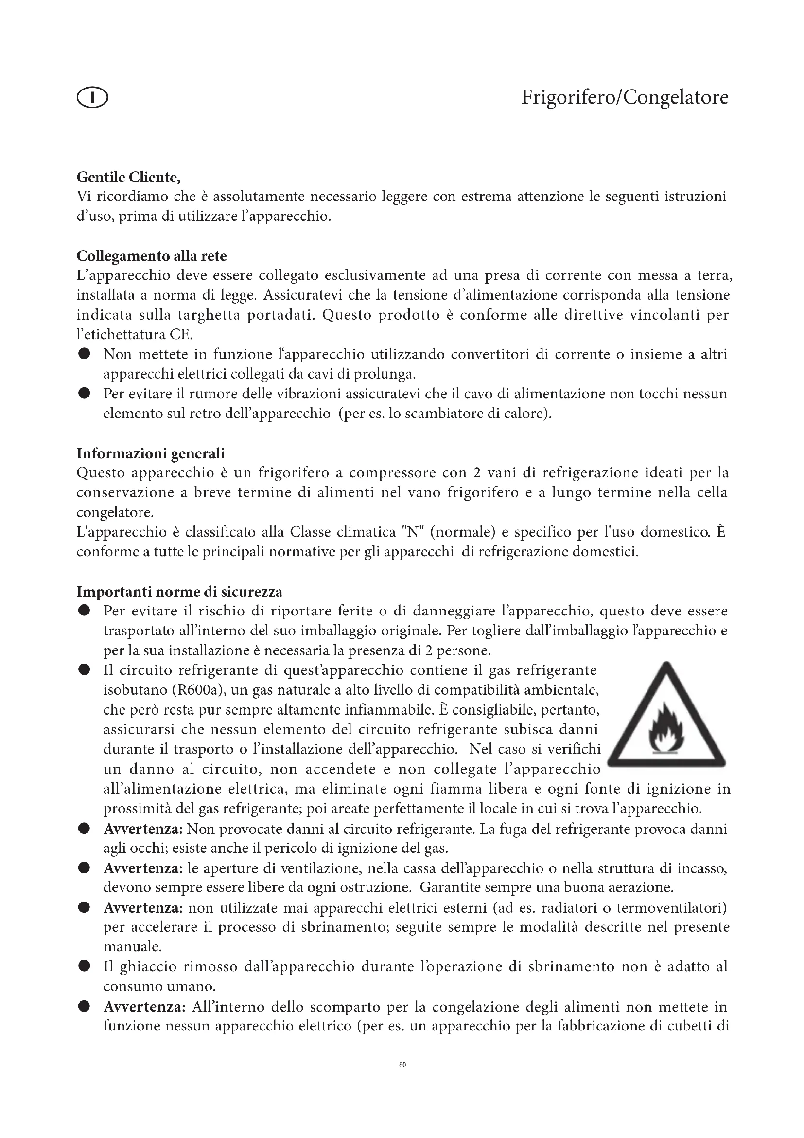 Capacidad de congelación, kg/24h 3 Temperatura de congelación, °C -18 Dimensiones (en mm) 1445 x 550 x 570 Peso, kg 51 Especificaciones eléctricas Ver placa de características Espuma aislante Ciclopentano Emisión de ruido 40 dB(A) 59Frigorifero/Congelatore Gentile Cliente, Vi ricordiamo che è assolutamente necessario leggere con estrema attenzione le seguenti istruzioni d’uso, prima di utilizzare l’apparecchio. Collegamento alla rete L’apparecchio deve essere collegato esclusivamente ad una presa di corrente con messa a terra, installata a norma di legge. Assicuratevi che la tensione d’alimentazione corrisponda alla tensione indicata sulla targhetta portadati. Questo prodotto è conforme alle direttive vincolanti per l’etichettatura CE. Non mettete in funzione l‘apparecchio utilizzando convertitori di corrente o insieme a altri ● apparecchi elettrici collegati da cavi di prolunga. Per evitare il rumore delle vibrazioni assicuratevi che il cavo di alimentazione non tocchi nessun ● elemento sul retro dell’apparecchio (per es. lo scambiatore di calore). Informazioni generali Questo apparecchio è un frigorifero a compressore con 2 vani di refrigerazione ideati per la conservazione a breve termine di alimenti nel vano frigorifero e a lungo termine nella cella congelatore. L'apparecchio è classificato alla Classe climatica "N" (normale) e specifico per l'uso domestico. È conforme a tutte le principali normative per gli apparecchi di refrigerazione domestici. Importanti norme di sicurezza Per evitare il rischio di riportare ferite o di danneggiare l’apparecchio, questo deve essere ● trasportato all’interno del suo imballaggio originale. Per togliere dall’imballaggio l’apparecchio e per la sua installazione è necessaria la presenza di 2 persone. Il circuito refrigerante di quest’apparecchio contiene il gas refrigerante ● isobutano (R600a), un gas naturale a alto livello di compatibilità ambientale, che però resta pur sempre altamente infiammabile. È consigliabile, pertanto, assicurarsi che nessun elemento del circuito refrigerante subisca danni durante il trasporto o l’installazione dell’apparecchio. Nel caso si verifichi un danno al circuito, non accendete e non collegate l’apparecchio all’alimentazione elettrica, ma eliminate ogni fiamma libera e ogni fonte di ignizione in prossimità del gas refrigerante; poi areate perfettamente il locale in cui si trova l’apparecchio. Avvertenza: ● Non provocate danni al circuito refrigerante. La fuga del refrigerante provoca danni agli occhi; esiste anche il pericolo di ignizione del gas. Avvertenza: ● le aperture di ventilazione, nella cassa dell’apparecchio o nella struttura di incasso, devono sempre essere libere da ogni ostruzione. Garantite sempre una buona aerazione. Avvertenza: ● non utilizzate mai apparecchi elettrici esterni (ad es. radiatori o termoventilatori) per accelerare il processo di sbrinamento; seguite sempre le modalità descritte nel presente manuale. Il ghiaccio rimosso dall’apparecchio durante l’operazione di sbrinamento non è adatto al ● consumo umano. Avvertenza: ● All’interno dello scomparto per la congelazione degli alimenti non mettete in funzione nessun apparecchio elettrico (per es. un apparecchio per la fabbricazione di cubetti di