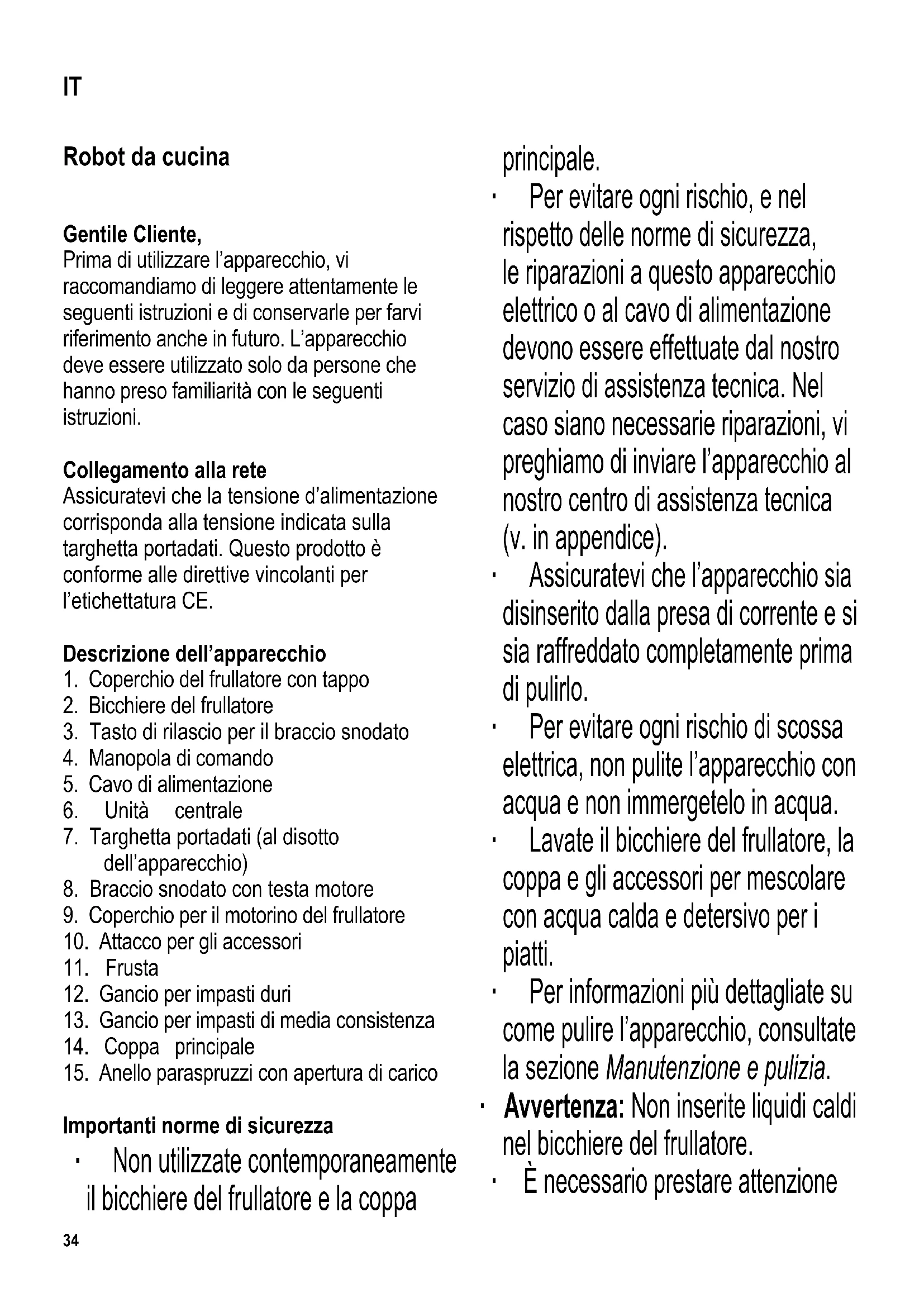 Importanti norme di sicurezza ∙ Non utilizzate contemporaneamente il bicchiere del frullatore e la coppa principale. ∙ Per evitare ogni rischio, e nel rispetto delle norme di sicurezza, le riparazioni a questo apparecchio elettrico o al cavo di alimentazione devono essere effettuate dal nostro servizio di assistenza tecnica. Nel caso siano necessarie riparazioni, vi preghiamo di inviare l’apparecchio al nostro centro di assistenza tecnica (v. in appendice). ∙ Assicuratevi che l’apparecchio sia disinserito dalla presa di corrente e si sia raffreddato completamente prima di pulirlo. ∙ Per evitare ogni rischio di scossa elettrica, non pulite l’apparecchio con acqua e non immergetelo in acqua. ∙ Lavate il bicchiere del frullatore, la coppa e gli accessori per mescolare con acqua calda e detersivo per i piatti. ∙ Per informazioni più dettagliate su come pulire l’apparecchio, consultate la sezione Manutenzione e pulizia. ∙ Avvertenza: Non inserite liquidi caldi nel bicchiere del frullatore. ∙ È necessario prestare attenzione IT35 quando versate liquidi caldi nella coppa principale o nel frullatore nel caso si formi un getto di vapore caldo. ∙ Avvertenza: Il cattivo uso può essere causa di gravi lesioni alla persona. ∙ Avvertenza: Le lame del frullatore sono molto affi late. Per evitare lesioni prestate estrema attenzione quando pulite o svuotate il bicchiere. ∙ Disinserite sempre la spina dalla presa - se lasciate l’apparecchio incustodito, - dopo l’uso, - in caso di cattivo funzionamento, - prima di pulire, montare o smontare l’apparecchio, - prima di cambiare uno qualsiasi degli accessori. ∙ Per disinserire la spina dalla presa di corrente, non tirate mai il cavo di alimentazione ma afferrate direttamente la spina. ∙ Questo apparecchio è studiato per il solo uso domestico o per impieghi simili, come per esempio - dal personale di negozi, uffi ci o altri ambienti di lavoro simili, - in aziende agricole, - da clienti di alberghi, motel e sistemazioni simili, - da clienti di pensioni „bed-and- breakfast“ (letto & colazione). ∙ L‘apparecchio può essere usato anche da persone con ridotte capacità fi siche sensoriali o mentali, a condizione che siano sotto sorveglianza, che siano state date loro istruzioni sull‘uso dell‘apparecchio e che comprendano pienamente i rischi e le precauzioni di sicurezza che l‘apparecchio comporta. ∙ Ai bambini non deve essere consentito l‘utilizzo dell‘apparecchio. L‘apparecchio e il cavo di alimentazione devono essere tenuti fuori della portata dei bambini. ∙ Ai bambini non deve essere consentito di giocare con l‘apparecchio. ∙ Avvertenza: Tutto il materiale di imballaggio deve essere tenuto fuori della portata dei bambini a causa del rischio potenziale esistente, per esempio di soffocamento.36 ∙ Prima di ogni utilizzo dell’apparecchio, controllate attentamente che l’apparecchio e gli accessori inseriti non presentino tracce di deterioramento. Se per esempio fosse caduto battendo su una superfi cie dura, o se è stata usata una forza eccessiva nel tirare il cavo di alimentazione, l’apparecchio non va più usato: danni anche invisibili ad occhio nudo potrebbero comportare conseguenze negative sulla sicurezza nel funzionamento dell’apparecchio. ∙ Non permettete che il cavo di alimentazione tocchi mai delle superfi ci calde o si trovi a contatto con sorgenti di calore. ∙ Non permettete che il cavo di alimentazione penda liberamente. ∙ Non toccate con le mani nessun elemento in movimento durante il funzionamento dell’apparecchio e non inserite nessun attrezzo (per esempio raschietti per impasti o cucchiai da cucina) nel bicchiere del frullatore se il motore non si è fermato completamente. ∙ Nessuna responsabilità verrà assunta in caso di danni risultanti da un uso errato o dalla non conformità alle istruzioni. Funzionamento per periodi brevi L’apparecchio è stato designato per funzionare esclusivamente per brevi periodi e non dovrebbe perciò esser utilizzato per oltre 3 minuti di seguito. Occorrerà poi, prima di riaccenderlo, spegnere l’apparecchio e lasciare al motore il tempo di raffreddarsi. Prima di adoperare l’apparecchio per la prima volta Per procedere al primo utilizzo dell’apparecchio, lavate tutti gli accessori nel modo indicato nella sezione Manutenzione e pulizia. Manopola di controllo L’apparecchio è dotato di un interruttore di controllo di tipo rotante, regolabile girandolo all’infi nito. È possibile selezionare le seguenti posizioni: P alta velocità a colpi brevi (pulse) 0 apparecchio spento 1 velocità molto bassa 2-3 velocità bassa 4-5 velocità media 6 velocità alta Uso della coppa principale Avvertenza: Quando utilizzate la coppa principale, il bicchiere del frullatore non deve essere inserito, e il coperchio per il motorino del frullatore deve essere messo in sede, perché altrimenti la formazione di calore potrebbe danneggiare l’apparecchio. Movimento planetario: Gli accessori (frusta, gancio per impastare, ecc.) ve ngono fi ssati in modo decentrato, generando un movimento rotatorio intorno ai propri assi oltre che intorno agli assi motore principali. Questo tipo di movimento garantisce la miscelatura degli ingredienti dai lati della coppa verso il centro. Impostazioni della velocità ∙ Cominciate sempre dall’impostazione di velocità bassa, specialmente per la lavorazione di ingredienti liquidi o cremosi, o per un qualsiasi amalgama contenente farina. ∙ Le impostazioni da 1 a 3 sono ideali37 per frullare lentamente, amalgamare, mescolare ingredienti e per lavorare ingredienti liquidi e lavorare impasti. ∙ L’impostazione 4 è adatta per preparare impasti per ciambelle o pasticcini. ∙ Le impostazioni 5 e 6 sono adatte per battere gli ingredienti con la frusta. Frusta La frusta è adatta per mescolare delicatamente ingredienti liquidi, come per esempio salse, albumi e panna. La frusta può essere usata con le impostazioni 