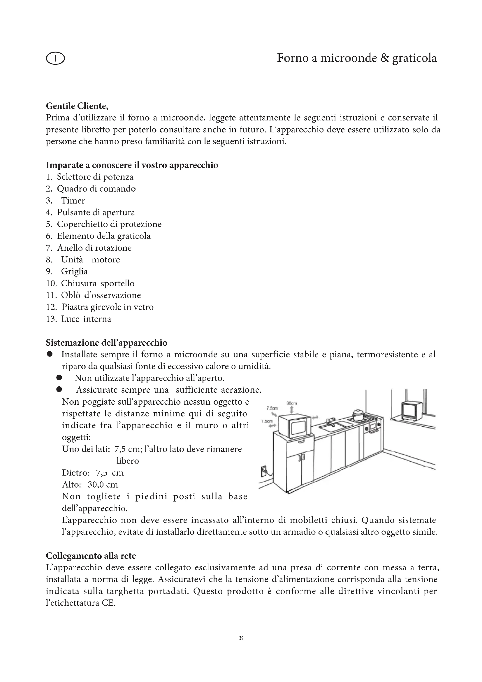 Sistemazione dell’apparecchio Installate sempre il forno a microonde su una superficie stabile e piana, termoresistente e al riparo da qualsiasi fonte di eccessivo calore o umidità. Non utilizzate l’apparecchio all’aperto. Assicurate sempre una sufficiente aerazione. Non poggiate sull’apparecchio nessun oggetto e rispettate le distanze minime qui di seguito indicate fra l’apparecchio e il muro o altri oggetti: Uno dei lati: 7,5 cm; l’altro lato deve rimanere libero Dietro: 7,5 cm Alto: 30,0 cm Non togliete i piedini posti sulla base dell’apparecchio. L’apparecchio non deve essere incassato all’interno di mobiletti chiusi. Quando sistemate l’apparecchio, evitate di installarlo direttamente sotto un armadio o qualsiasi altro oggetto simile. Collegamento alla rete L’apparecchio deve essere collegato esclusivamente ad una presa di corrente con messa a terra, installata a norma di legge. Assicuratevi che la tensione d’alimentazione corrisponda alla tensione indicata sulla targhetta portadati. Questo prodotto è conforme alle direttive vincolanti per l’etichettatura CE.