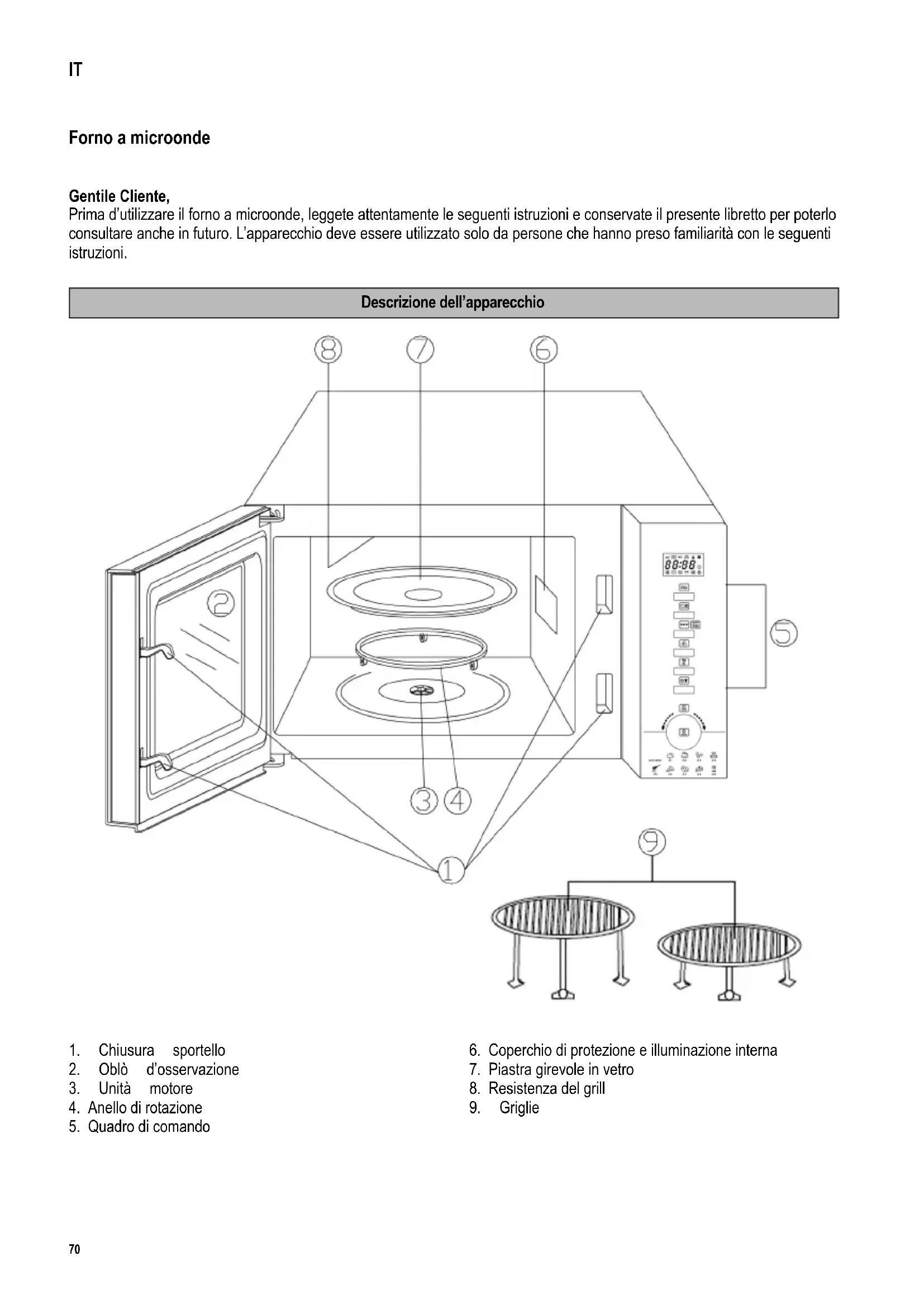Descrizione del pannello di controllo Tasto Funzione Microonde Orologio / Peso Grill Funzioni combinate grill e microonde Aria calda Funzioni combinate di microonde e aria calda Stop / Interruzione Manopola di controllo Funzione Avvio / Avvio rapido Programmi di cottura automatica / Tempo Display - Immissione comandi (Enter) - Pre-riscaldamento - Programmi automatici - Quantità unitaria per programma di cottura automatica - Funzionamento - Ora corrente Sul display è indicata l’ora corrente del giorno o, durante il funzionamento, il tempo programmato in corso e le funzioni selezionate. - Orologio - Funzione di aria calda - Funzione grill - Funzione microonde - Scongelamento - Memorizzazione - Dispositivo di sicurezza per i bambini72 Norme di sicurezza Importanti norme di sicurezza Vi preghiamo di leggere le seguenti istruzioni con attenzione e di conservare il manuale per farvi riferimento anche in futuro. Collegamento alla rete L’apparecchio deve essere collegato esclusivamente a una presa di corrente con messa a terra, installata a norma di legge. Assicuratevi che la tensione di alimentazione corrisponda alla tensione indicata sulla targhetta portadati. Questo prodotto è conforme alle direttive vincolanti per l’etichettatura CE. Sistemazione dell’apparecchio ∙ Installate sempre il forno a microonde sopra a una superfi cie stabile e piana, termoresistente e al riparo da qualsiasi fonte di eccessivo calore o umidità. ∙ Non utilizzate l’apparecchio all’aperto. ∙ Non togliete i piedini posti sulla base dell’apparecchio. ∙ Assicurate sempre una suffi ciente aerazione. Non poggiate sull’apparecchio nessun oggetto e rispettate le distanze minime qui di seguito indicate fra l’apparecchio e il muro o altri oggetti: Lati: 7,5 cm Dietro: 7,5 cm Alto: 30,0 cm L’apparecchio non deve essere incassato all’interno di mobiletti chiusi. Quando sistemate l’apparecchio, evitate di installarlo direttamente sotto un armadio o qualsiasi altro oggetto simile. Consigli utili ∙ Avvertenza: Alcuni alimenti possono prendere fuoco. Non lasciate mai, in nessuna circostanza, l’apparecchio incustodito durante l’uso delle microonde, del grill, della ventilazione forzata o delle funzioni combinate. ∙ Questo forno a microonde è stato progettato esclusivamente per lo scongelamento, il riscaldamento e la cottura degli alimenti. Avvertenza: ogni tentativo di riscaldare cibi secchi o capi di abbigliamento, cuscinetti scaldini, pantofole, spugne, strofi nacci bagnati ecc.: può essere causa di ferite, fuoco o incendio. ∙ Nessuna responsabilità verrà assunta in caso di danni risultanti da un uso erroneo o dalla non conformità alle istruzioni. ∙ Utilizzate solo utensili da cucina adatti. Non usate nessun contenitore metallico per riscaldare alimenti o bevande quando utilizzate la funzione a microonde. Per maggiori informazioni, consultate la sezione Utilizzate sempre utensili da cucina73 idonei. ∙ L’apparecchio non è previsto per l’utilizzo con un timer esterno o con un sistema separato di comando a distanza. ∙ Il presente apparecchio può essere usato da bambini (di almeno 8 anni di età) e da persone con ridotte capacità fi siche, sensoriali o mentali, o da persone senza particolari esperienze o conoscenze, purché siano sotto sorveglianza o siano state date loro istruzioni sull’uso dell’apparecchio e comprendano pienamente i rischi e le precauzioni di sicurezza che l’apparecchio comporta. ∙ Ai bambini non deve essere consentito di giocare con l’apparecchio. ∙ Ai bambini non deve essere consentito di effettuare lavori di pulitura o di manutenzione dell’apparecchio senza la supervisione di un adulto. ∙ L’apparecchio e il cavo di alimentazione devono essere tenuti sempre fuori della portata di bambini di età inferiore agli 8 anni. ∙ Per evitare ogni rischio di scossa elettrica, non pulite l’apparecchio con acqua e non immergetelo in acqua. ∙ Avvertenza: A causa delle alte temperature raggiunte durante l’utilizzo delle funzioni combinate, i bambini non dovrebbero utilizzare l’apparecchio senza l’adeguata sorveglianza di un adulto. ∙ Nell’utilizzare le funzioni combinate o il grill e/o le funzioni a ventilazione forzata, prestate estrema attenzione a non toccare gli elementi riscaldanti interni. ∙ È decisamente sconsigliato l’uso di apparecchi di pulizia a vapore per pulire questo forno. ∙ Spegnete sempre l’apparecchio e disinserite la spina dalla presa di corrente: - durante ogni pulizia, - in caso di cattivo funzionamento. - dopo ogni uso. ∙ Per disinserire la spina dalla presa di corrente, non tirate mai il cavo di alimentazione ma afferrate direttamente la spina. ∙ Attenzione: Le superfi ci esterne dell’apparecchio potrebbero riscaldarsi durante l’uso. Esiste anche il rischio di emissione di vapore attraverso le fenditure di aerazione: pericolo di scottature. ∙ Evitate che l’apparecchio o il cavo d’alimentazione si trovino a contatto con fonti di calore. Non lasciate pendere liberamente il cavo di alimentazione e tenetelo lontano dagli elementi riscaldanti. ∙ La mancanza di una corretta pulizia dell’apparecchio potrebbe danneggiare la qualità delle superfi ci e comportare l’eventuale diminuzione del ciclo di vita oltre che potenziali rischi per la sicurezza di chi lo utilizza. È bene quindi eliminare immediatamente ogni residuo di cibo. Per informazioni più dettagliate su come pulire l’apparecchio, consultate la sezione Pulizia.74 ∙ Questo apparecchio è studiato per il solo uso domestico o per impieghi simili, come per esempio - cucine per il personale, negozi, uffi ci e altri ambienti simili di lavoro, - aziende agricole, - clienti di alberghi, motel e stabilimenti simili, - clienti di pensioni “bed-and-breakfast” (letto & colazione). ∙ Attenzione: Ogni manutenzione o assistenza che esiga la rimozione del coperchietto di protezione contro i raggi a microonde costituisce un rischio grave 