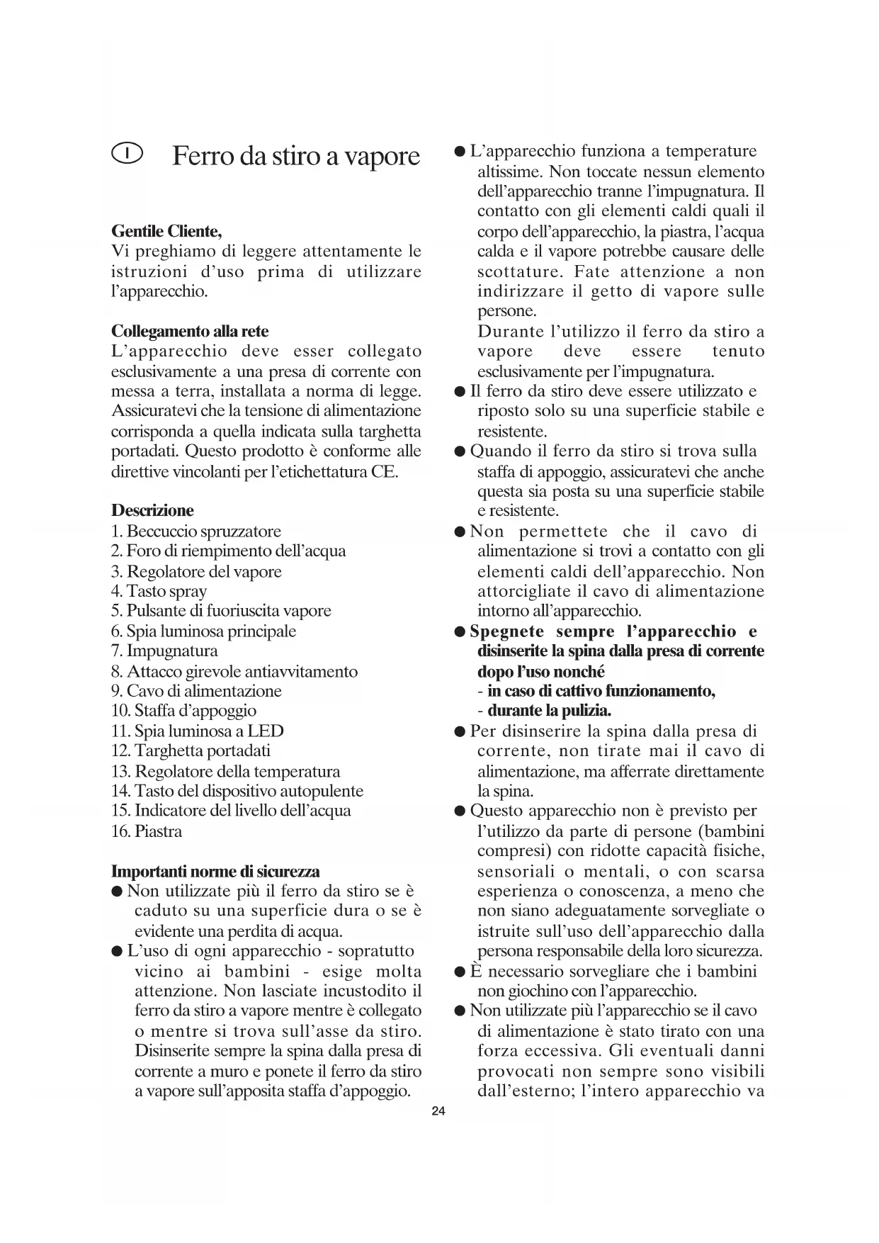 Importanti norme di sicurezza ● Non utilizzate più il ferro da stiro se è caduto su una superficie dura o se è evidente una perdita di acqua. ● L’uso di ogni apparecchio - sopratutto vicino ai bambini - esige molta attenzione. Non lasciate incustodito il ferro da stiro a vapore mentre è collegato o mentre si trova sull’asse da stiro. Disinserite sempre la spina dalla presa di corrente a muro e ponete il ferro da stiro a vapore sull’apposita staffa d’appoggio. ● L’apparecchio funziona a temperature altissime. Non toccate nessun elemento dell’apparecchio tranne l’impugnatura. Il contatto con gli elementi caldi quali il corpo dell’apparecchio, la piastra, l’acqua calda e il vapore potrebbe causare delle scottature. Fate attenzione a non indirizzare il getto di vapore sulle persone. Durante l’utilizzo il ferro da stiro a vapore deve essere tenuto esclusivamente per l’impugnatura. ● Il ferro da stiro deve essere utilizzato e riposto solo su una superficie stabile e resistente. ● Quando il ferro da stiro si trova sulla staffa di appoggio, assicuratevi che anche questa sia posta su una superficie stabile e resistente. ● Non permettete che il cavo di alimentazione si trovi a contatto con gli elementi caldi dell’apparecchio. Non attorcigliate il cavo di alimentazione intorno all’apparecchio. ● Spegnete sempre l’apparecchio e disinserite la spina dalla presa di corrente dopo l’uso nonché - in caso di cattivo funzionamento, - durante la pulizia. ● Per disinserire la spina dalla presa di corrente, non tirate mai il cavo di alimentazione, ma afferrate direttamente la spina. ● Questo apparecchio non è previsto per l’utilizzo da parte di persone (bambini compresi) con ridotte capacità fisiche, sensoriali o mentali, o con scarsa esperienza o conoscenza, a meno che non siano adeguatamente sorvegliate o istruite sull’uso dell’apparecchio dalla persona responsabile della loro sicurezza. ● È necessario sorvegliare che i bambini non giochino con l’apparecchio. ● Non utilizzate più l’apparecchio se il cavo di alimentazione è stato tirato con una forza eccessiva. Gli eventuali danni provocati non sempre sono visibili dall’esterno; l’intero apparecchio va