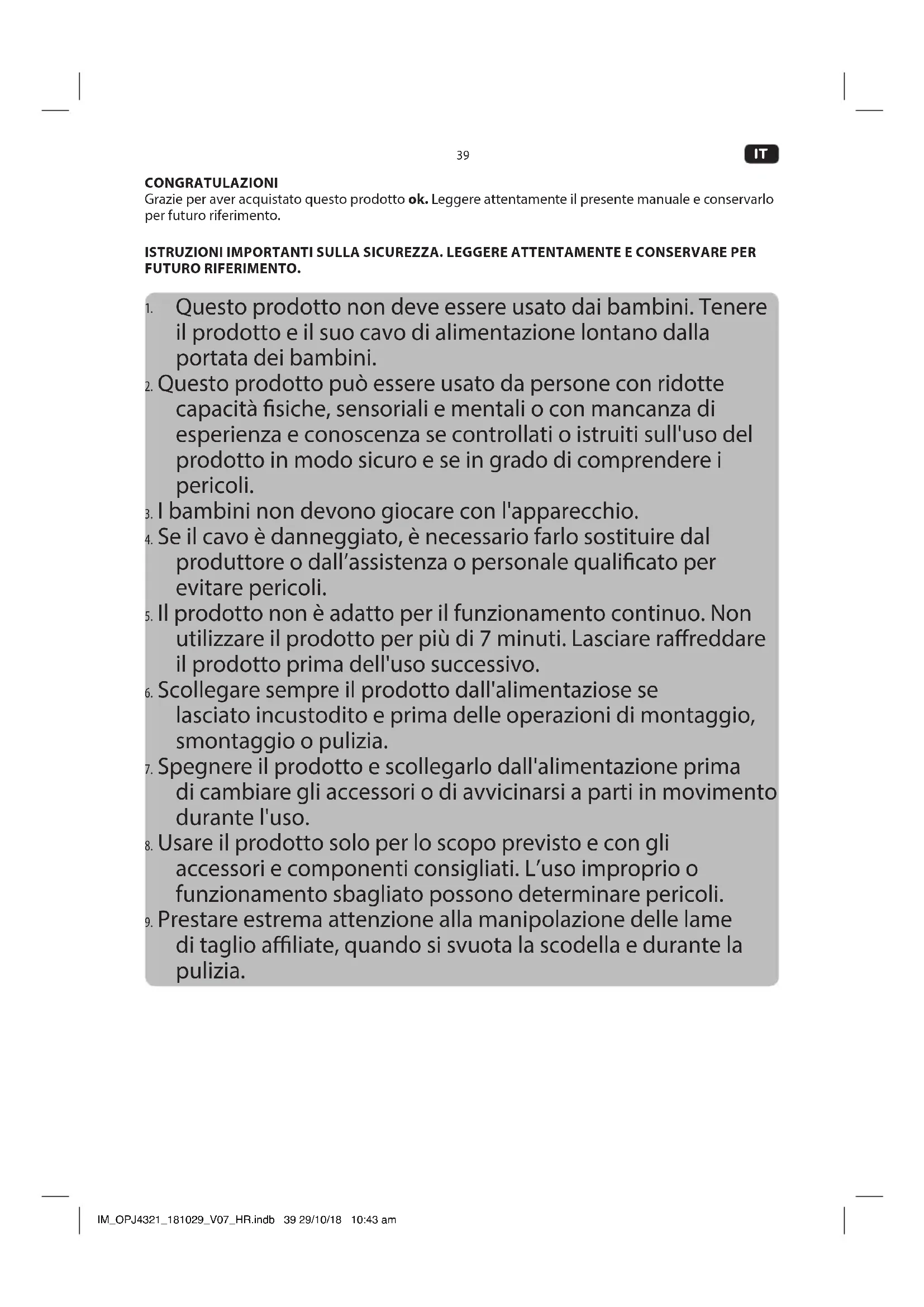 - Conservare l'apparecchio in un luogo fresco e asciutto, lontano dalla portata di bambini e animali domestici. IM_OPJ4321_181029_V07_HR.indb 43 29/10/18 10:43 am44 Size = A5