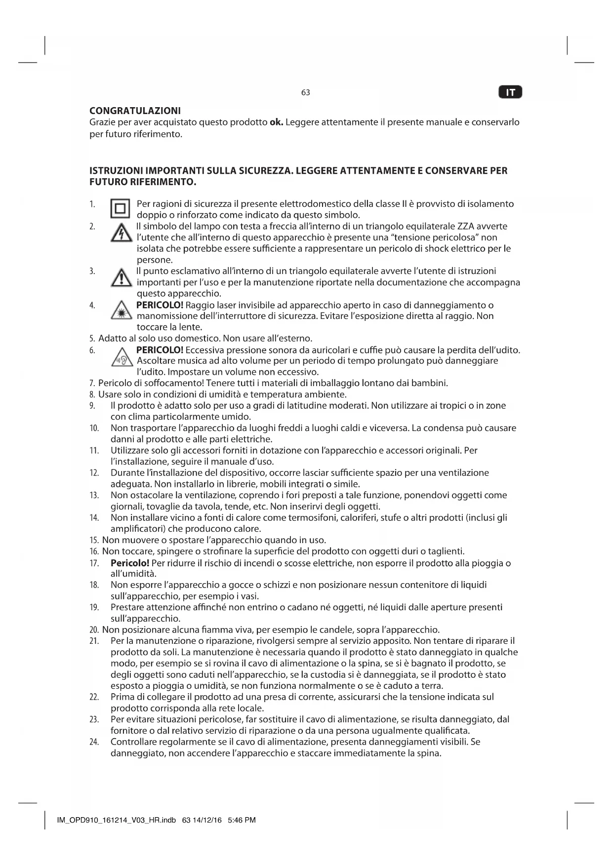 sovraccarico elettrico, scollegare e ricollegare il dispositivo o rimuovere le batterie e installarle nuovamente. USO PREVISTO Questo prodotto è progettato solo per l’intrattenimento audio e video. Qualsiasi altro utilizzo può arrecare danni all’apparecchio o infortuni. Imtron GmbH non si assume responsabilità per danni al prodotto, danni alla proprietà o per lesioni personali derivanti da mancanza di attenzione o utilizzo non corretto del prodotto o utilizzo del prodotto che non soddisfa lo scopo specico del produttore. IM_OPD910_161214_V03_HR.indb 64 14/12/16 5:46 PM65