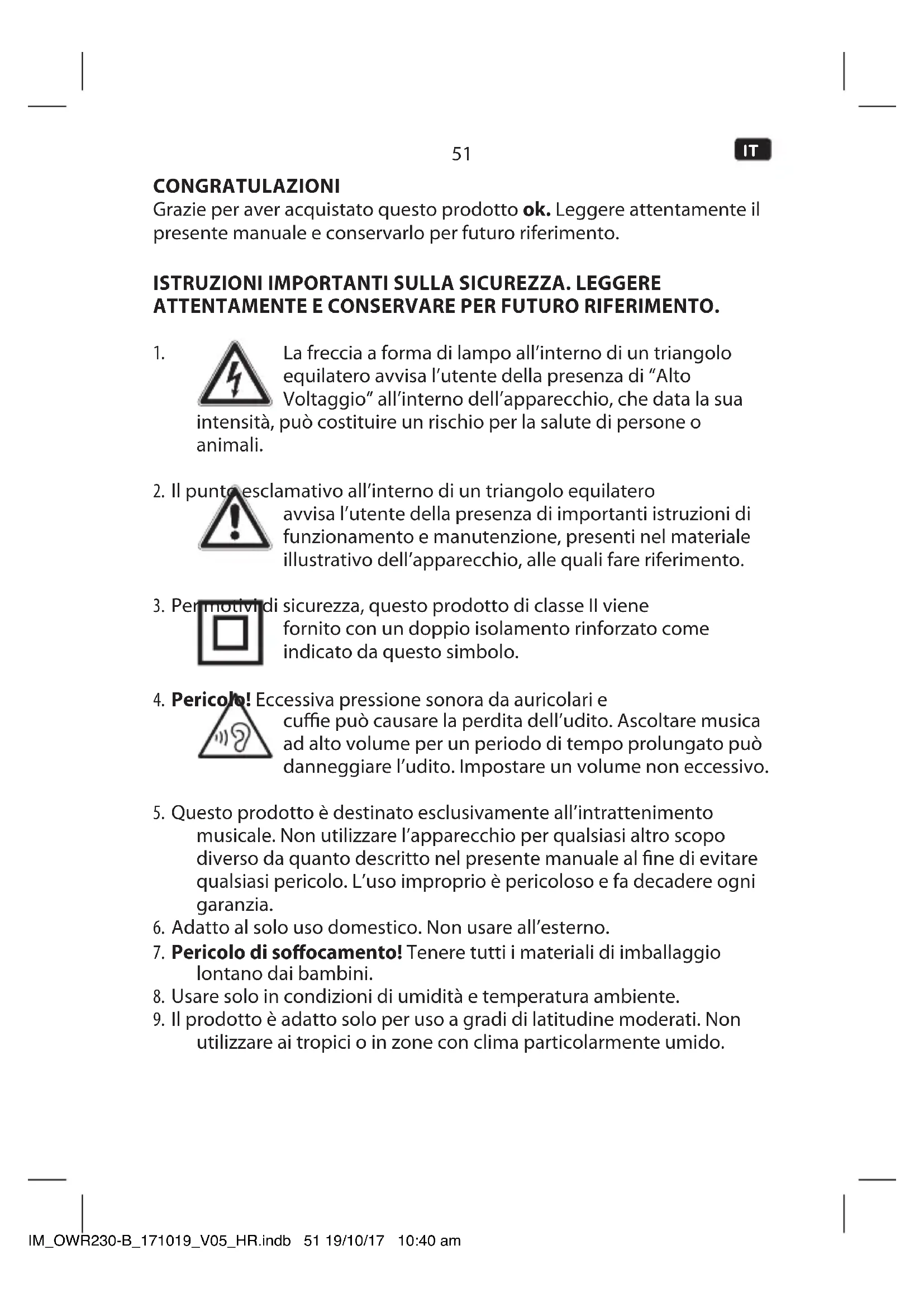gettarle in maniera adeguata. Evitare di toccare occhi e pelle con l’acido delle batterie. In caso di contatto dell’acido delle batterie con gli occhi, sciacquarli subito e con molta acqua e consultare urgentemente un medico. In caso di contatto dell’acido delle batterie con la pelle, lavare l’area in questione con abbondante acqua e sapone. USO PREVISTO Il presente articolo é destinato alla riproduzione audio via FM/AM Radio, AUX IN o cue. Qualsiasi altro uso puo causare danni al prodotto o lesioni. Questo prodotto e progettato esclusivamente per l’uso domestico e non e destinato all’uso commerciale. Imtron GmbH non si assume responsabilità per danni al prodotto, danni alla proprietà o per lesioni personali derivanti da mancanza di attenzione o utilizzo non corretto del prodotto o utilizzo del prodotto che non soddisfa lo scopo specico del produttore. IM_OWR230-B_171019_V05_HR.indb 54 19/10/17 10:40 am55
