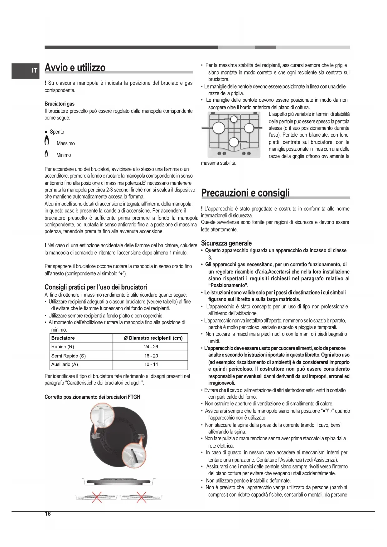 - Al momento dell’ebollizione ruotare la manopola no alla posizione di minimo. Ø Diametro recipienti (cm)Rapido (R)Semi Rapido (S)Ausiliario (A)24 - 2616 - 2010 - 14Bruciatore Per identicare il tipo di bruciatore fate riferimento ai disegni presenti nel paragrafo “Caratteristiche dei bruciatori ed ugelli”. Corretto posizionamento dei bruciatori FTGH