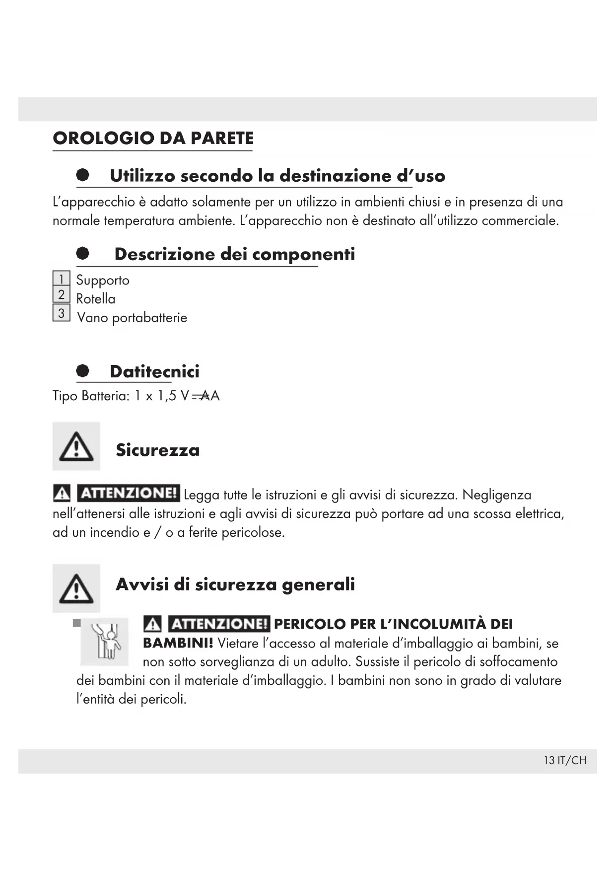 PERICOLO DI VITA! Le batterie possono essere ingoiate con conseguente pericolo di vita. Se è stata ingoiata la batteria, rivolgersi immediatamente alle cure di un medico. Non metta in funzione l’apparecchiatura se è danneggiata. Le riparazioni dovrebbero essere eseguite solo da personale specializzato. Informazioni per la sicurezza della batteria PERICOLO DI VITA! Tenere le batterie fuori dalla portata dei bambini. In caso di ingestione accidentale, rivolgersi immediatamente a un medico. Attenzione! PERICOLO DI ESPLOSIONE! Non ricaricare mai batterie non ricaricabili; non cortocircuitare e/o aprire le batterie. Non gettare mai le batterie in acqua o sul fuoco. Non esercitare carichi meccanici sulle batterie. Rischio di perdite dalle batterie In caso di perdite, rimuovere immediatamente la batteria per evitare danni al dispositivo. Evitare il contatto con pelle, occhi e membrane mucose. In caso di contatto con gli acidi contenuti nella batteria, sciacquare abbondantemente la parte interessata con acqua pulita e rivolgersi immediatamente a un medico.15 IT/CH Evitare condizioni e temperature estreme come, ad esempio, termosifoni, luce diretta del sole e così via, che potrebbero danneggiare la batteria. In caso di inutilizzo prolungato, rimuovere la batteria dal dispositivo. Rischio di danni alle cose Utilizzare solo il tipo di batterie consigliato! Inserire la batteria rispettando la corretta polarità! Se necessario, pulire la batteria e i contatti del dispositivo prima dell‘inserimento. Rimuovere immediatamente la batteria scarica dal prodotto. § Messa in funzione Togliete l’isolamento della batteria tra batteria e contatto. Vedere la fig. B per la sostituzione della batteria. § Utilizzo Impostazione dell’ora Per impostare l’ora, girare la rotella