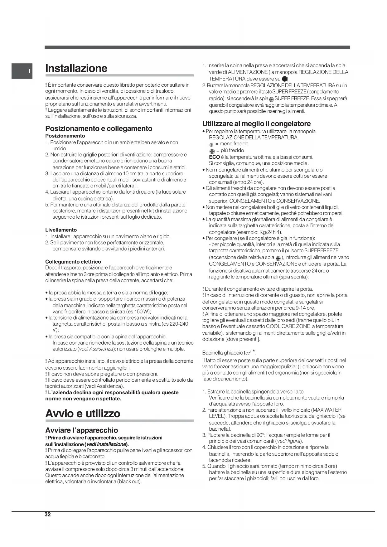 ! Prima di collegare l’apparecchio pulire bene i vani e gli accessori conacqua tiepida e bicarbonato.! L’apparecchio è provvisto di un controllo salvamotore che faavviare il compressore solo dopo circa 8 minuti dall’accensione.Questo accade anche dopo ogni interruzione dell’alimentazioneelettrica, volontaria o involontaria (black out).1. Inserire la spina nella presa e accertarsi che si accenda la spiaverde di ALIMENTAZIONE (la manopola REGILAZIONE DELLATEMPERATURA deve essere su 2. Ruotare la manopola REGOLAZIONE DELLA TEMPERATURA su unvalore medio e premere il tasto SUPER FREEZE (congelamentorapido): si accenderà la spia SUPER FREEZE. Essa si spegneràquando il congelatore avrà raggiunto la temperatura ottimale. Aquesto punto sarà possibile inserire gli alimenti. Utilizzare al meglio il congelatore