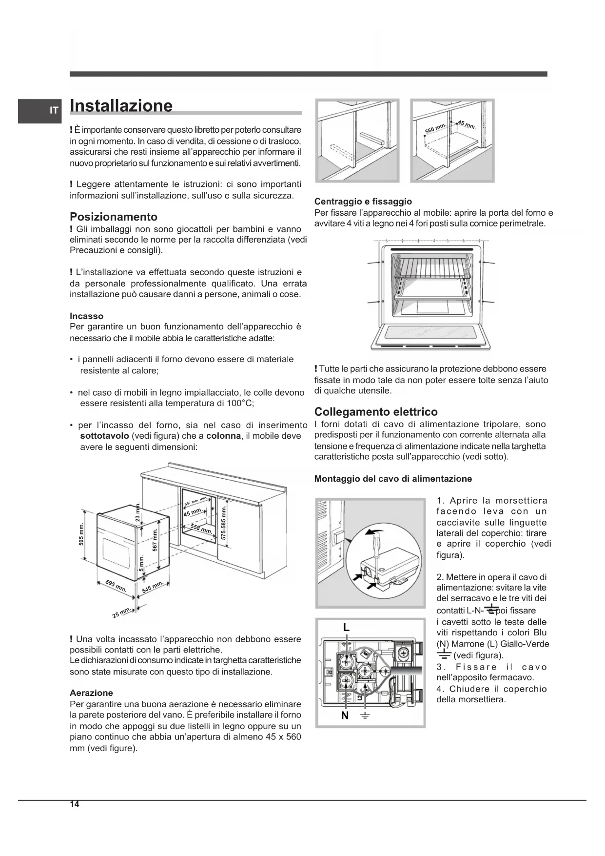 - per l’incasso del forno, sia nel caso di inserimento sottotavolo (vedi gura) che a colonna, il mobile deve avere le seguenti dimensioni: 595 mm. 595 mm.25 mm.545 mm.5 mm.567 mm.23 mm.575-585 mm.45 mm.558 mm. 547 mm. min. ! Una volta incassato l’apparecchio non debbono essere possibili contatti con le parti elettriche. Le dichiarazioni di consumo indicate in targhetta caratteristiche sono state misurate con questo tipo di installazione. Aerazione Per garantire una buona aerazione è necessario eliminare la parete posteriore del vano. È preferibile installare il forno in modo che appoggi su due listelli in legno oppure su un piano continuo che abbia un’apertura di almeno 45 x 560 mm (vedi gure). 560 mm. 45 mm. Centraggio e ssaggio Per ssare l’apparecchio al mobile: aprire la porta del forno e avvitare 4 viti a legno nei 4 fori posti sulla cornice perimetrale. ! Tutte le parti che assicurano la protezione debbono essere ssate in modo tale da non poter essere tolte senza l’aiuto di qualche utensile. Collegamento elettrico I forni dotati di cavo di alimentazione tripolare, sono predisposti per il funzionamento con corrente alternata alla tensione e frequenza di alimentazione indicate nella targhetta caratteristiche posta sull’apparecchio (vedi sotto). Montaggio del cavo di alimentazione