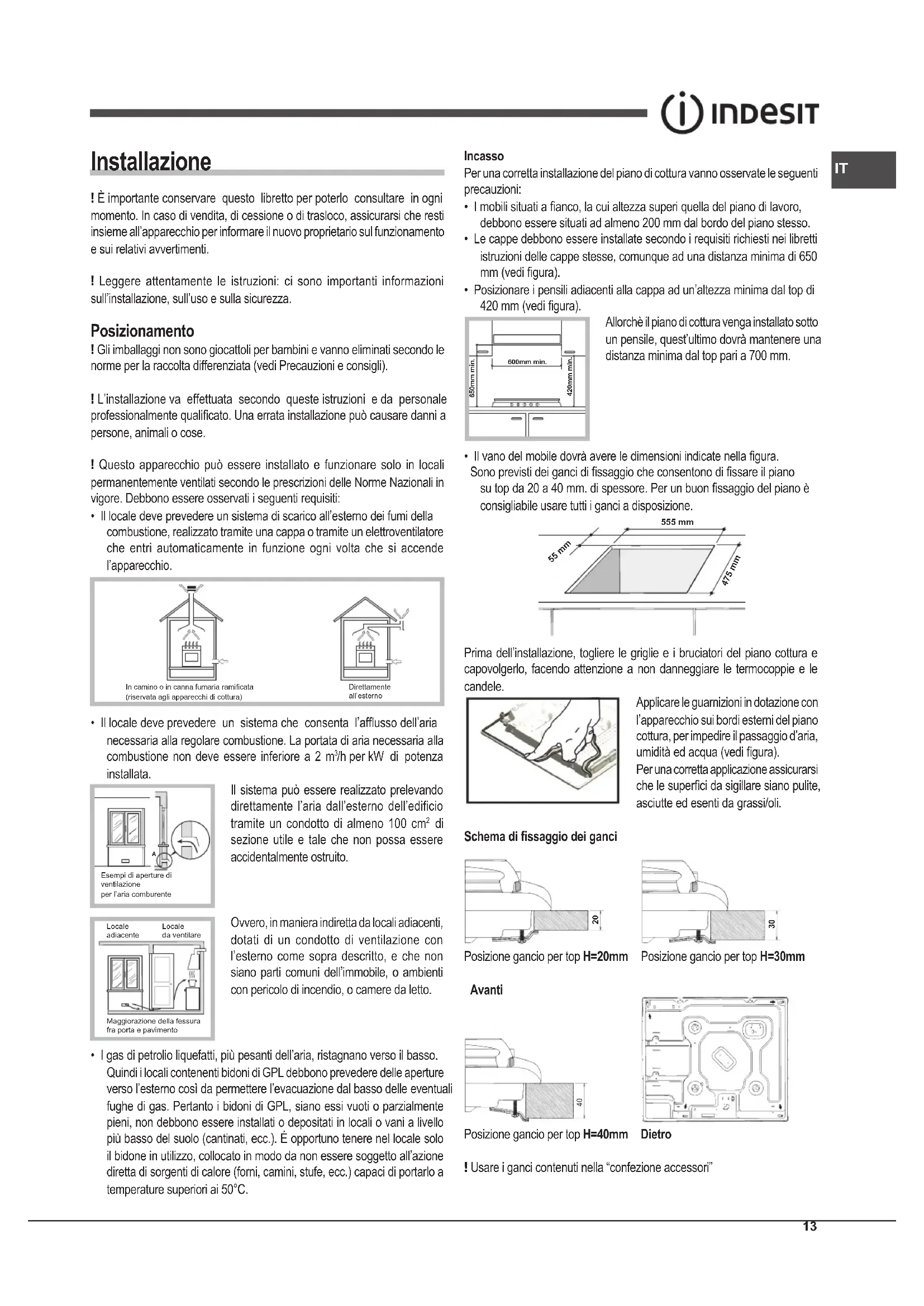 Installazione ! È importante conservare questo libretto per poterlo consultare in ogni momento. In caso di vendita, di cessione o di trasloco, assicurarsi che resti insieme all’apparecchio per informare il nuovo proprietario sul funzionamento e sui relativi avvertimenti. ! Leggere attentamente le istruzioni: ci sono importanti informazioni sull’installazione, sull’uso e sulla sicurezza. Posizionamento ! Gli imballaggi non sono giocattoli per bambini e vanno eliminati secondo le norme per la raccolta differenziata (vedi Precauzioni e consigli). ! L’installazione va effettuata secondo queste istruzioni e da personale professionalmente qualicato. Una errata installazione può causare danni a persone, animali o cose. ! Questo apparecchio può essere installato e funzionare solo in locali permanentemente ventilati secondo le prescrizioni delle Norme Nazionali in vigore. Debbono essere osservati i seguenti requisiti: