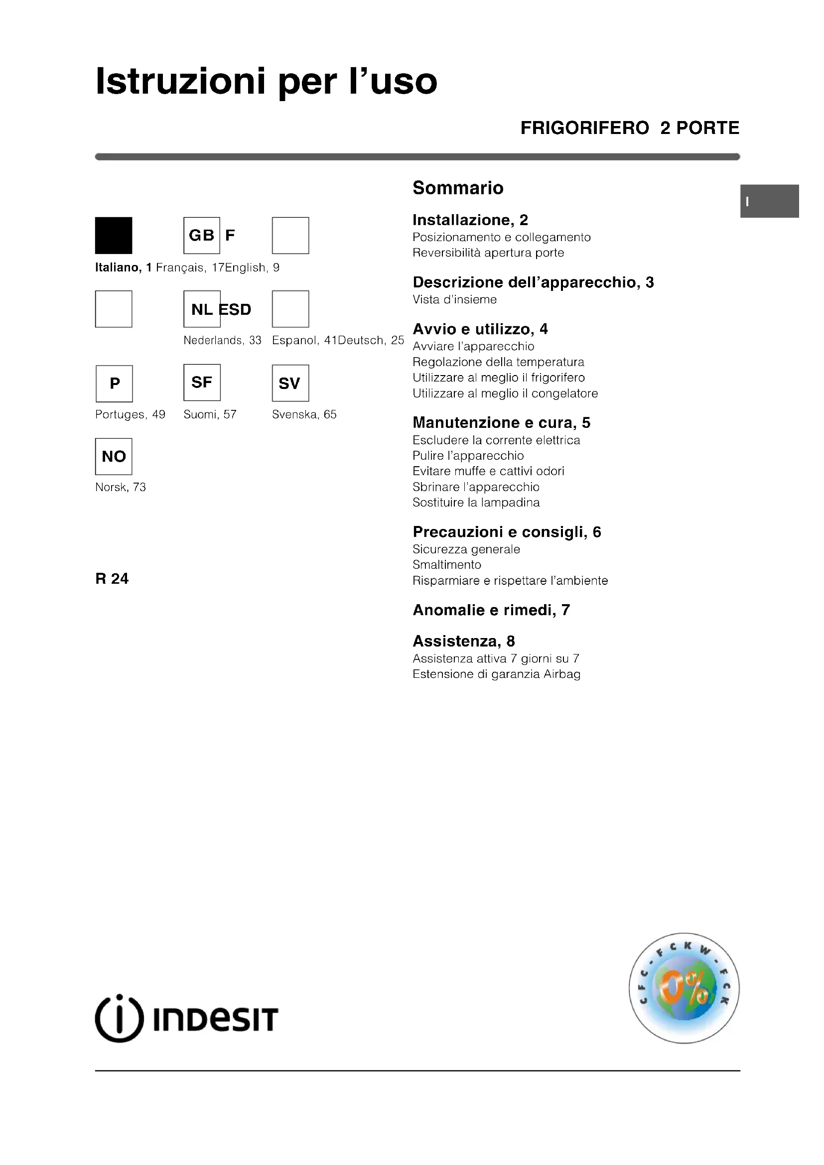 Istruzioni per luso FRIGORIFERO 2 PORTE Sommario Installazione, 2 Posizionamento e collegamento Reversibilità apertura porte Descrizione dellapparecchio, 3 Vista d’insieme Avvio e utilizzo, 4 Avviare l’apparecchio Regolazione della temperatura Utilizzare al meglio il frigorifero Utilizzare al meglio il congelatore Manutenzione e cura, 5 Escludere la corrente elettrica Pulire l’apparecchio Evitare muffe e cattivi odori Sbrinare l’apparecchio Sostituire la lampadina Precauzioni e consigli, 6 Sicurezza generale Smaltimento Risparmiare e rispettare l’ambiente Anomalie e rimedi, 7 Assistenza, 8 Assistenza attiva 7 giorni su 7 Estensione di garanzia Airbag R 24 Italiano, 1 Français, 17English, 9 GBI F Nederlands, 33Espanol, 41Deutsch, 25 NL ESD Portuges, 49 Suomi, 57 Svenska, 65