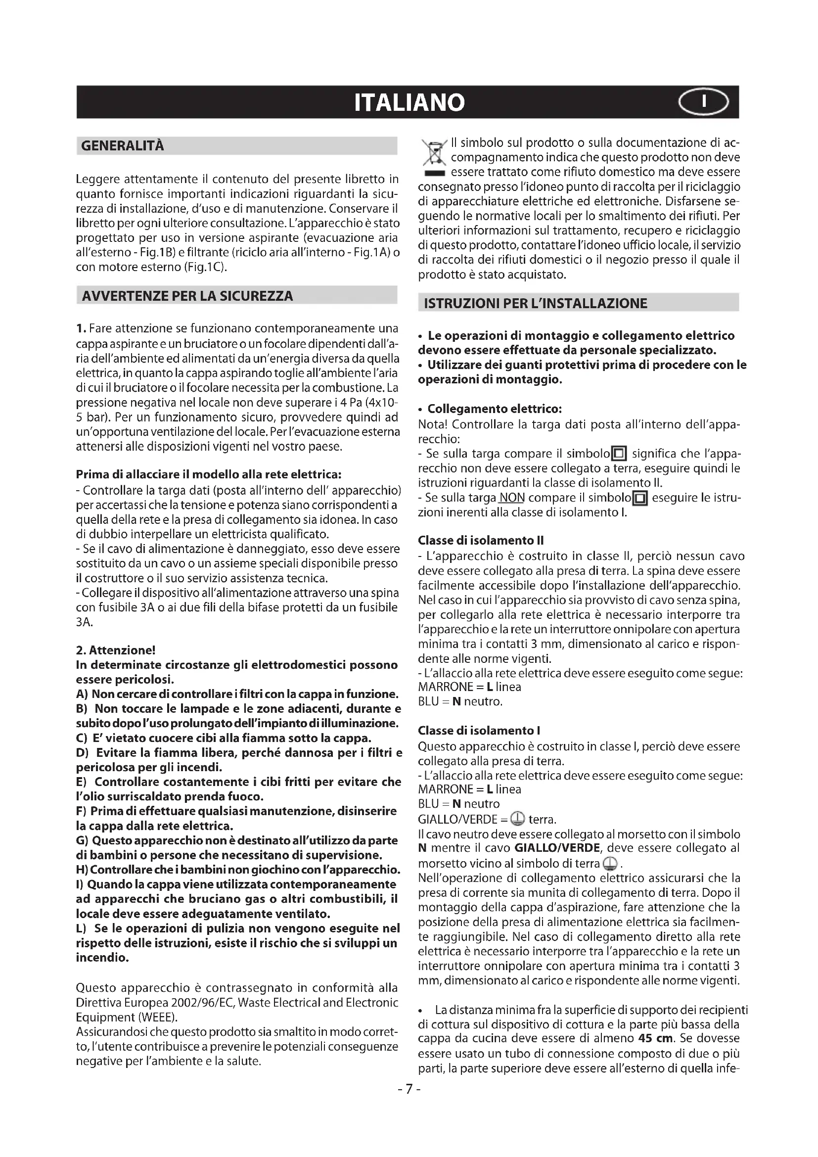 eseguire le istru- zioni inerenti alla classe di isolamento I. Classe di isolamento II - L’apparecchio è costruito in classe II, perciò nessun cavo deve essere collegato alla presa di terra. La spina deve essere facilmente accessibile dopo l’installazione dell’apparecchio. Nel caso in cui l’apparecchio sia provvisto di cavo senza spina, per collegarlo alla rete elettrica è necessario interporre tra l’apparecchio e la rete un interruttore onnipolare con apertura minima tra i contatti 3 mm, dimensionato al carico e rispon- dente alle norme vigenti. - L’allaccio alla rete elettrica deve essere eseguito come segue: MARRONE = L linea BLU = N neutro. Classe di isolamento I Questo apparecchio è costruito in classe I, perciò deve essere collegato alla presa di terra. - L’allaccio alla rete elettrica deve essere eseguito come segue: MARRONE = L linea BLU = N neutro GIALLO/VERDE = terra. Il cavo neutro deve essere collegato al morsetto con il simbolo N mentre il cavo GIALLO/VERDE, deve essere collegato al morsetto vicino al simbolo di terra