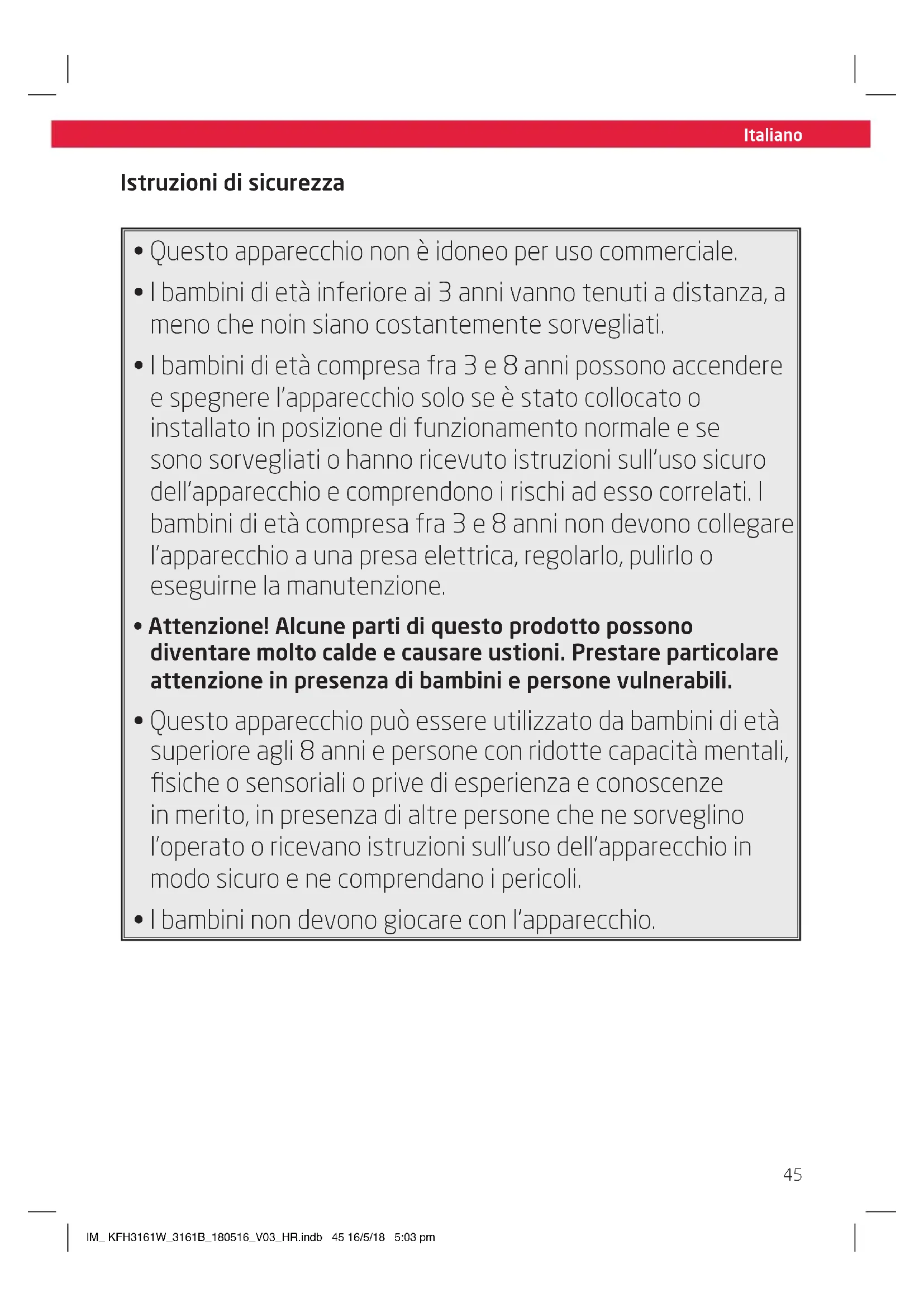 - I bambini non devono giocare con l’apparecchio. Istruzioni di sicurezza IM_ KFH3161W_3161B_180516_V03_HR.indb 45 16/5/18 5:03 pmItaliano