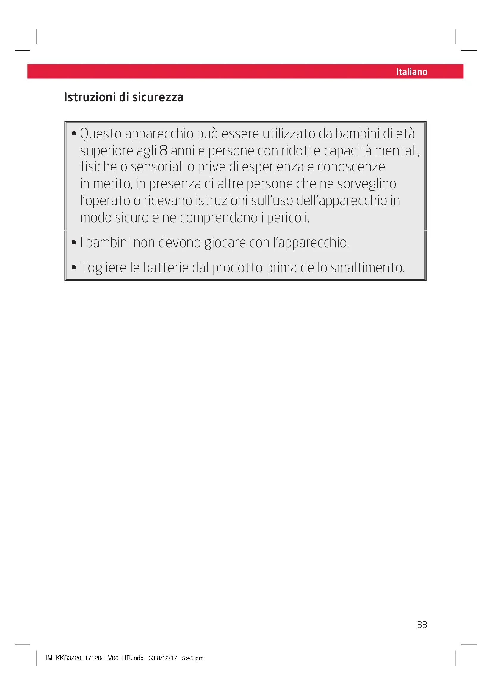 - Questo apparecchio può essere utilizzato da bambini di età superioreagli 8 anni e persone con ridotte capacità mentali, fisiche o sensoriali o prive di esperienza e conoscenze in merito, in presenza di altre personne che ne sorveglino l'operato o ricevano istruzioni sull'uso dell'apparecchio in modo sicuro e ne comprehendano i pericoli.