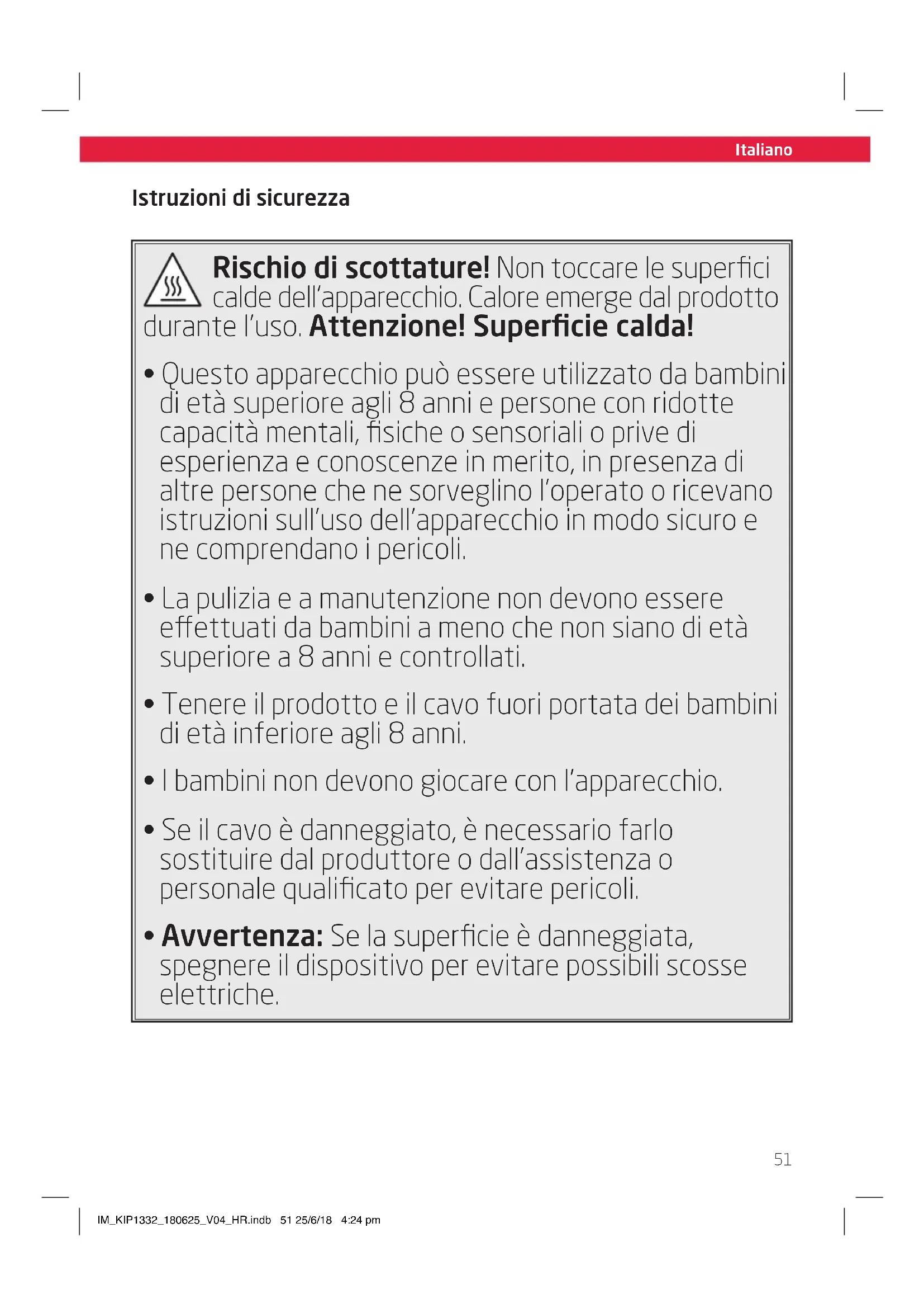 - Avvertenza: Se la superficie è danneggiata, spegnere il dispositivo per evitare possibili scosse elettriche. IM_KIP1332_180625_V04_HR.indb 51 25/6/18 4:24 pmItaliano