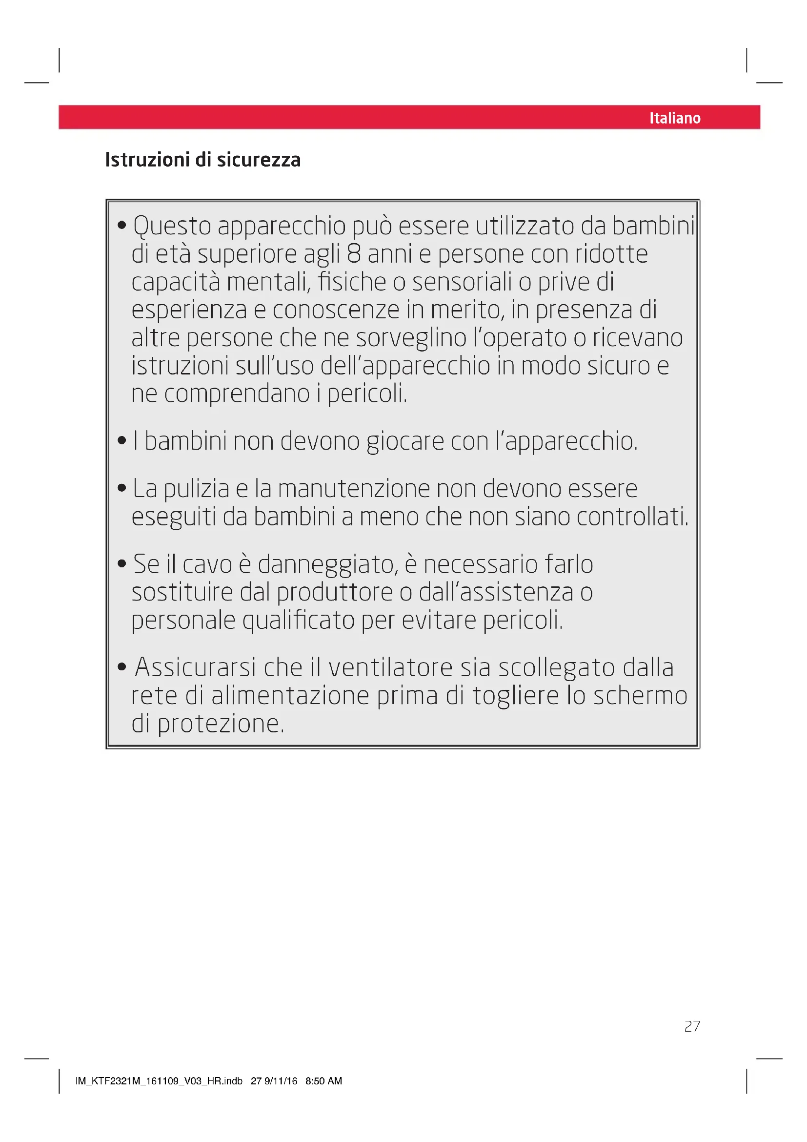 - Assicurarsi che il ventilatore sia scollegato dalla rete di alimentazione prima di togliere lo schermo di protezione. IM_KTF2321M_161109_V03_HR.indb 27 9/11/16 8:50 AMItaliano