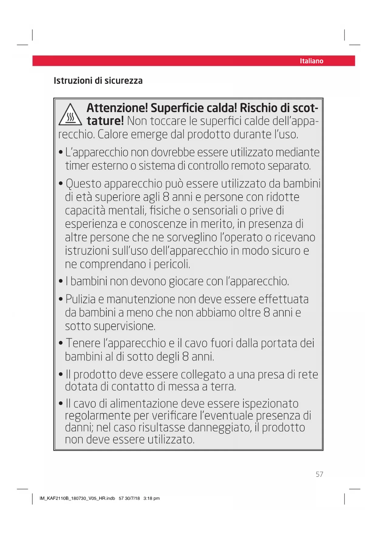 - Il cavo di alimentazione deve essere ispezionato regolarmente per verificare l'eventuale presenza di danni; nel caso risultasse danneggiato, il prodotto non deve essere utilizzato. IM_KAF2110B_180730_V05_HR.indb 57 30/7/18 3:18 pmSize - A5 Italiano