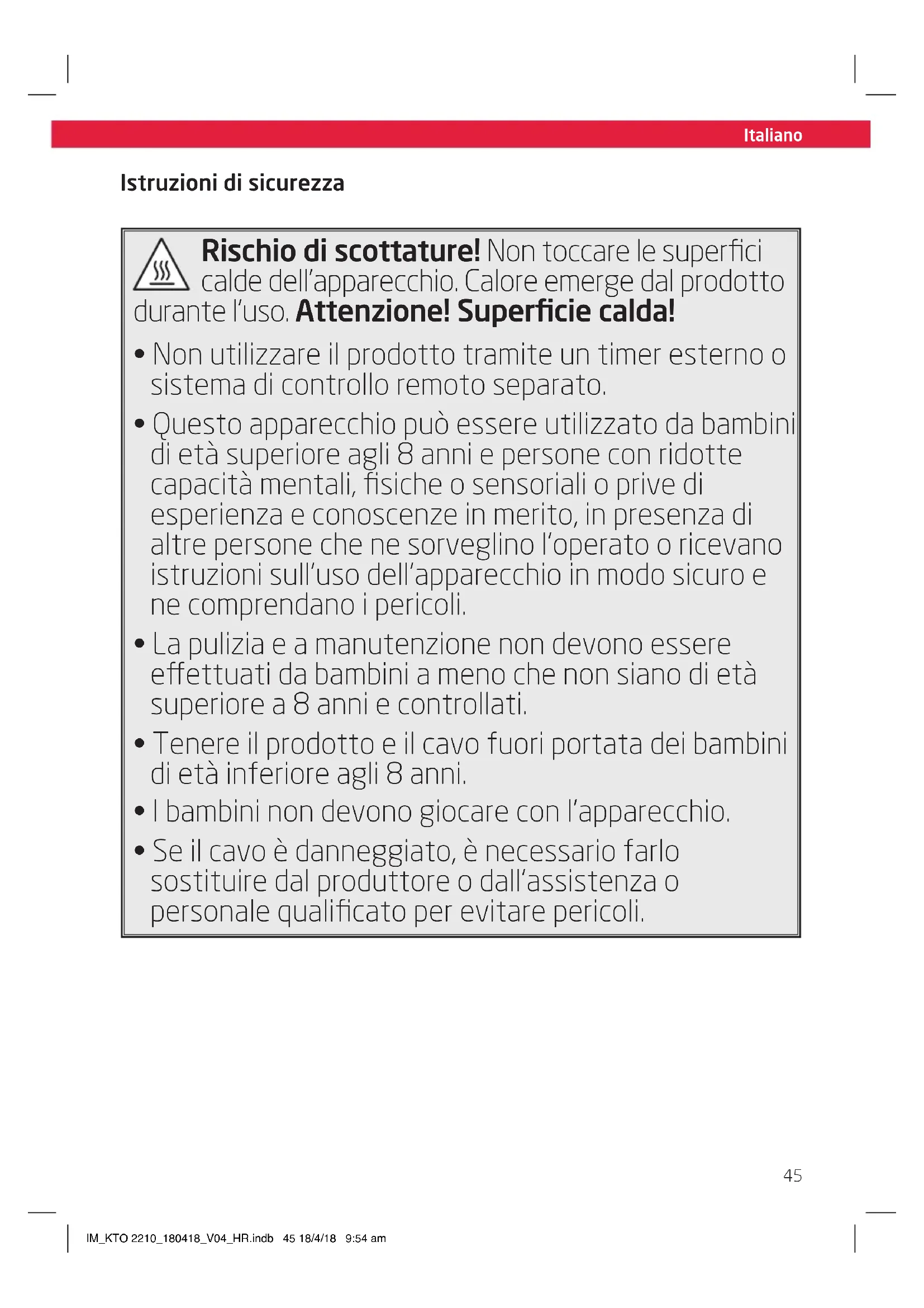 - Se il cavo è danneggiato, è necessario farlo sostituire dal produttore o dall’assistenza o personale qualificato per evitare pericoli. IM_KTO 2210_180418_V04_HR.indb 45 18/4/18 9:54 amItaliano