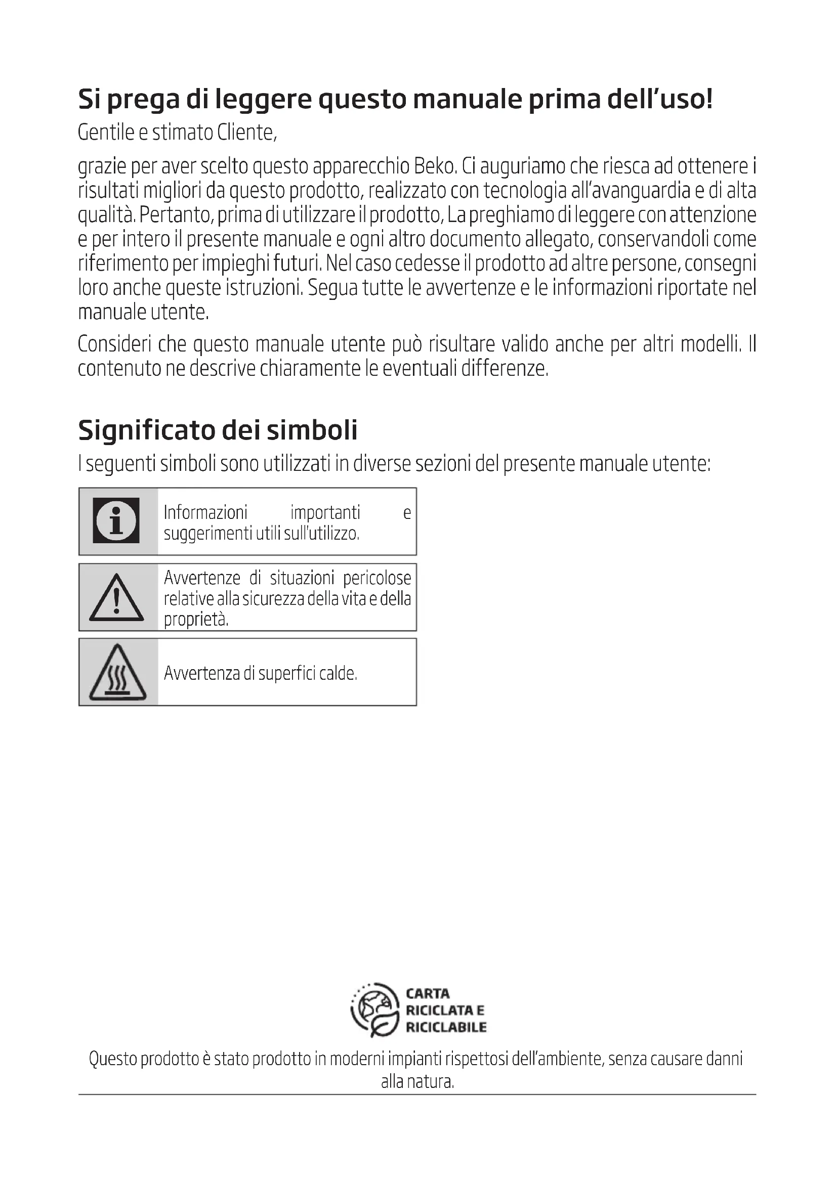 Avvertenze di situazioni pericolose relative alla sicurezza della vita e della proprietà. Avvertenza di superfici calde. Questo prodotto è stato prodotto in moderni impianti rispettosi dell’ambiente, senza causare danni alla natura.Forno a microonde / Manuale utente 118 / IT Importanti istruzioni di sicurezza Leggere attentamente e conservare per riferimenti futuri