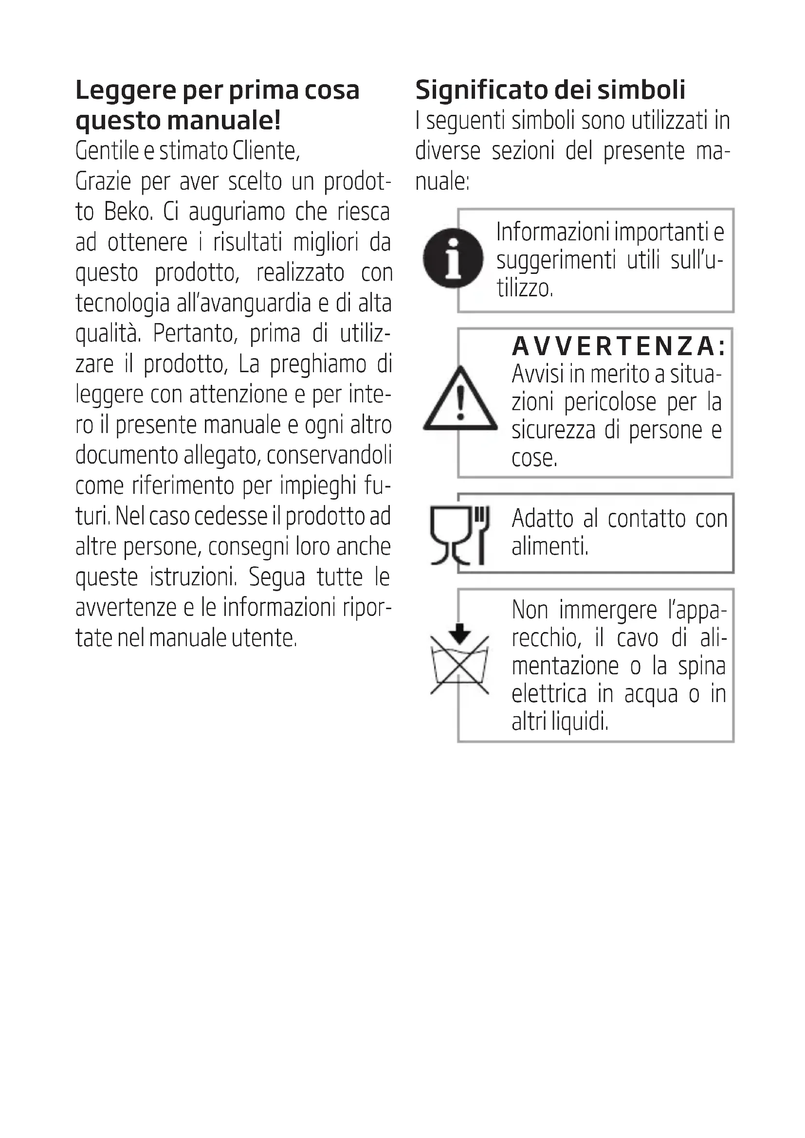 PRODUSUL NU BENEFICIAZĂ DE GARANȚIE LEGALĂ DE CONFORMITATE ȘI DE GARANȚIE COMERCIALĂ ÎN URMĂTOARELE CAZURI: a) nefuncționarea lămpilor de iluminare; b) accesoriile care nu au defecte ascunse de material constatate de tehnicienii Service Arctic; c) piesele şi accesoriile care prezintă lovituri, zgârieturi, spărturi sau deformări. Reclamațiile referitoare la aspectele prevăzute mai jos, se rezolvă numai contra cost : Nr. crt. Data Reclamaţiei Data primirii în reparaţie Programat Data ridicării aparatului Cauza întârzierii Reparaţia curentă şi/sau componenta înlocuită Prelungirea termenului de garanţie Efectuarea verificării SERVICE CLIENT Reparat F 227 - 07 ed. 3 4571420000 Drepturile consumatorului sunt cele prevazute în Legea 449/2003 (R1), modificată și completată de OG 9/2016, și OG 21/1992 (R2). Drepturile consumatorului nu sunt afectate prin garanția comercială oferită.Leggere per prima cosa questo manuale! Gentile e stimato Cliente, Grazie per aver scelto un prodot- to Beko. Ci auguriamo che riesca ad ottenere i risultati migliori da questo prodotto, realizzato con tecnologia all’avanguardia e di alta qualità. Pertanto, prima di utiliz- zare il prodotto, La preghiamo di leggere con attenzione e per inte- ro il presente manuale e ogni altro documento allegato, conservandoli come riferimento per impieghi fu- turi. Nel caso cedesse il prodotto ad altre persone, consegni loro anche queste istruzioni. Segua tutte le avvertenze e le informazioni ripor- tate nel manuale utente. Significato dei simboli I seguenti simboli sono utilizzati in diverse sezioni del presente ma- nuale: Informazioni importanti e suggerimenti utili sull’u- tilizzo. AVVERTENZA: Avvisi in merito a situa- zioni pericolose per la sicurezza di persone e cose. Adatto al contatto con alimenti. Non immergere l’appa- recchio, il cavo di ali- mentazione o la spina elettrica in acqua o in altri liquidi.Questo prodotto è stato realizzato in impianti all’avanguardia e rispettosi dell’ambiente. Questo dispositivo risulta confor- me alla direttiva RAEE.