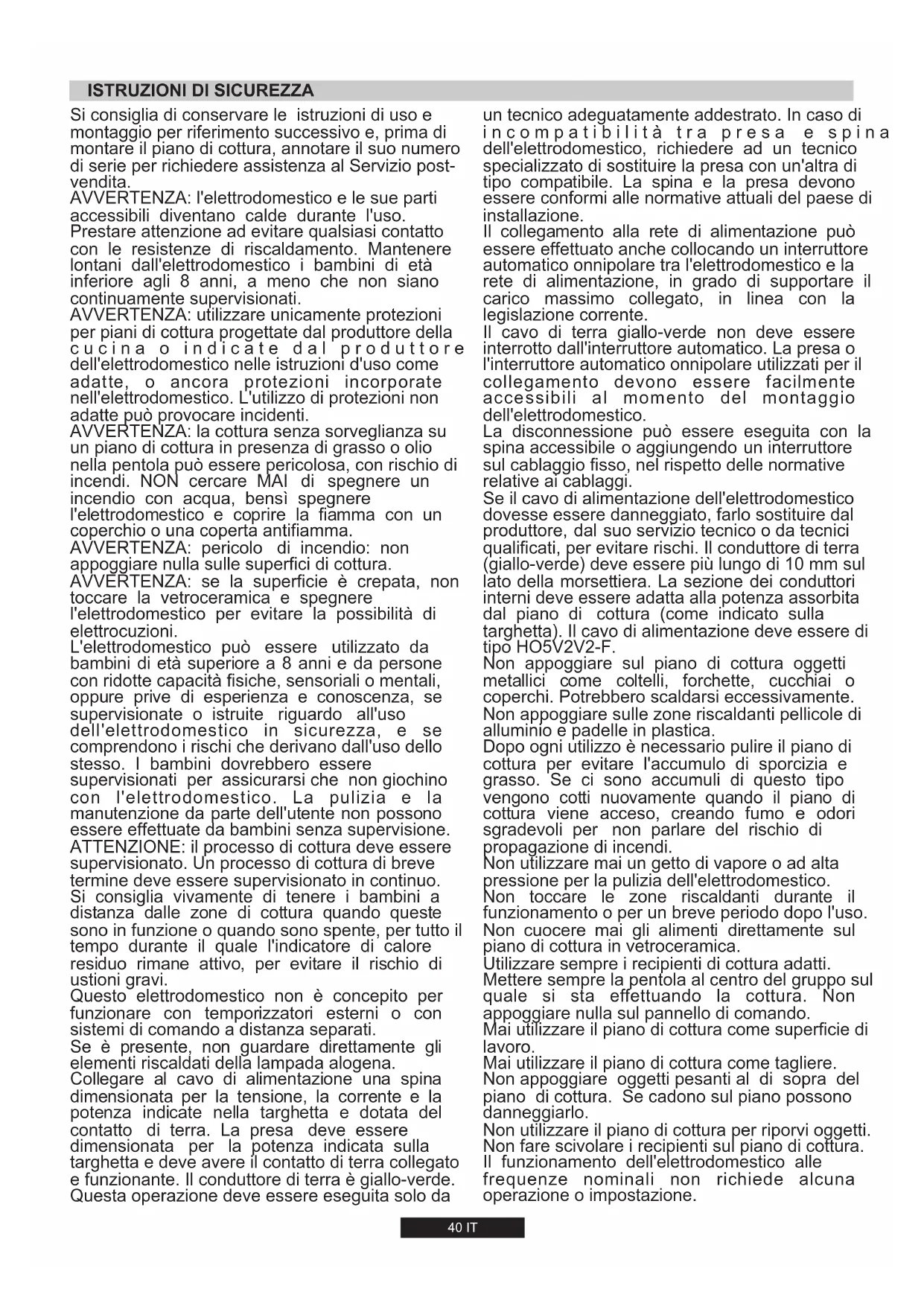 7,7 kW 734 l/h 560 g/h -40 IT AVVERTENZA: se la superficie è crepata, non toccare la vetroceramica e spegnere l'elettrodomestico per evitare la possibilità di elettrocuzioni. AVVERTENZA: l'elettrodomestico e le sue parti accessibili diventano calde durante l'uso. Prestare attenzione ad evitare qualsiasi contatto con le resistenze di riscaldamento. Mantenere lontani dall'elettrodomestico i bambini di età inferiore agli 8 anni, a meno che non siano continuamente supervisionati. AVVERTENZA: la cottura senza sorveglianza su un piano di cottura in presenza di grasso o olio nella pentola può essere pericolosa, con rischio di incendi. NON cercare MAI di spegnere un incendio con acqua, bensì spegnere l'elettrodomestico e coprire la fiamma con un coperchio o una coperta antifiamma. ATTENZIONE: il processo di cottura deve essere supervisionato. Un processo di cottura di breve termine deve essere supervisionato in continuo. Questo elettrodomestico non è concepito per funzionare con temporizzatori esterni o con sistemi di comando a distanza separati. Se è presente, non guardare direttamente gli elementi riscaldati della lampada alogena. Si consiglia di conservare le istruzioni di uso e montaggio per riferimento successivo e, prima di montare il piano di cottura, annotare il suo numero di serie per richiedere assistenza al Servizio post- vendita. AVVERTENZA: utilizzare unicamente protezioni per piani di cottura progettate dal produttore della c u c i n a o i n d i c a t e d a l p r o d u t t o r e dell'elettrodomestico nelle istruzioni d'uso come adatte, o ancora protezioni incorporate nell'elettrodomestico. L'utilizzo di protezioni non adatte può provocare incidenti. AVVERTENZA: pericolo di incendio: non appoggiare nulla sulle superfici di cottura. Collegare al cavo di alimentazione una spina dimensionata per la tensione, la corrente e la potenza indicate nella targhetta e dotata del contatto di terra. La presa deve essere dimensionata per la potenza indicata sulla targhetta e deve avere il contatto di terra collegato e funzionante. Il conduttore di terra è giallo-verde. Questa operazione deve essere eseguita solo da L'elettrodomestico può essere utilizzato da bambini di età superiore a 8 anni e da persone con ridotte capacità fisiche, sensoriali o mentali, oppure prive di esperienza e conoscenza, se supervisionate o istruite riguardo all'uso dell'elettrodomestico in sicurezza, e se comprendono i rischi che derivano dall'uso dello stesso. I bambini dovrebbero essere supervisionati per assicurarsi che non giochino con l'elettrodomestico. La pulizia e la manutenzione da parte dell'utente non possono essere effettuate da bambini senza supervisione. Si consiglia vivamente di tenere i bambini a distanza dalle zone di cottura quando queste sono in funzione o quando sono spente, per tutto il tempo durante il quale l'indicatore di calore residuo rimane attivo, per evitare il rischio di ustioni gravi.