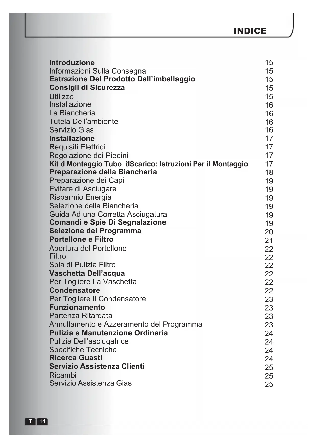 Asciutto No-Stiro - Asciutto Pronto-Stiro - +Sintetico Asciutto No-Stiro -Cotone Asciutto da Stirare -Tessuti Delicati NOTA: Installare e utilizzare il tubo di scarico per scaricare acqua condensata.l’Problemi che può risolvere l’utente Prima di rivolgersi al Centro Assistenza GIAS, consultare la seguente checklist. La chiamata verrà addebitata all'utente nel caso in cui risulti che la macchina funziona o è stata installata o utilizzata in maniera errata. Se il problema persiste anche dopo aver eseguito i controlli consigliati, rivolgersi al servizio di assistenza GIAS che sarà a disposizione per suggerire eventuali soluzioni per telefono. Il tempo di asciugatura residuo può variare durante il ciclo. Il tempo infatti viene costantemente aggiornato per migliorarne la stima. E' per tanto normale che durante il ciclo, il tempo mostrato sul display possa aumentare o diminuire. Tempo di asciugatura eccessivamente lungo/capi non sufficientemente asciutti… ჀIl programma/tempo di asciugatura selezionato è corretto? Ⴠ I capi sono stati introdotti eccessivamente bagnati? Si è provveduto a strizzare o centrifugare adeguatamente i capi prima d’introdurli nella macchina? Ⴠ Si deve pulire il filtro? Ⴠ Si deve pulire il condensatore? ჀL’asciugatrice è stata caricata eccessivamente? Ⴠ Vi sono ostruzioni a livello delle prese, degli sfiati e della base dell’asciugatrice? Ⴠ Il tasto è stato selezionato da un ciclo precedente? L’asciugatrice non funziona… Ⴠ L’alimentazione elettrica cui è collegata la macchina è attiva? Controllare provando con un altro apparecchio (ad esempio, lampada da tavolo). Ⴠ La spina di alimentazione è stata collegata correttamente all’alimentazione elettrica? Ⴠ Manca la corrente? Ⴠ Fusibile bruciato? Ⴠ Il portellone è stato chiuso perfettamente? Ⴠ La macchina è stata opportunamente attivata (sia collegata all’alimentazione sia attivata localmente)? Ⴠ È stato selezionato il tempo o il programma di asciugatura? ჀLa macchina è stata riattivata dopo aver aperto il portellone? ჀLa macchina ha smesso di funzionare perché la vaschetta dell’acqua è piena e deve essere svuotata? Se il problema persiste anche dopo aver effettuato tutti icontrolli consigliati, rivolgersi al Servizio Assistenza GIAS. Sarà a disposizione per suggerire eventuali soluzioni per telefono o per fissare la visita del tecnico in base alle condizioni di garanzia. Si ricorda che l’intervento del tecnico può essere soggetto a pagamento nel caso la macchina: Ⴠ risulti perfettamente funzionante. Ⴠ non sia stata installata secondo quanto indicato nelle istruzioni d’installazione. Ⴠ sia stata utilizzata in modo improprio. Utilizzare sempre ricambi originali, disponibili direttamente presso il Servizio Assistenza GIAS. Per assistenza e riparazioni, rivolgersi al tecnico del Servizio Assistenza GIAS più vicino. L’asciugatrice fa molto rumore… Ⴠ Spegnere l’asciugatrice e rivolgersi al Servizio Assistenza GIAS. La spia di segnalazione è accesa… Ⴠ Si deve pulire il filtro? Ⴠ Si deve pulire il condensatore? La spia di segnalazione è accesa… Ⴠ Si deve svuotare la vaschetta dell’acqua? Il produttore declina ogni responsabilità in caso di eventuali errori di stampa nel presente opuscolo. Il produttore si riserva il diritto di apportare le necessarie modifiche ai propri prodotti, senza alterarne le caratteristiche essenziali. RICERCA GUASTI Quale Può Essere La Causa...