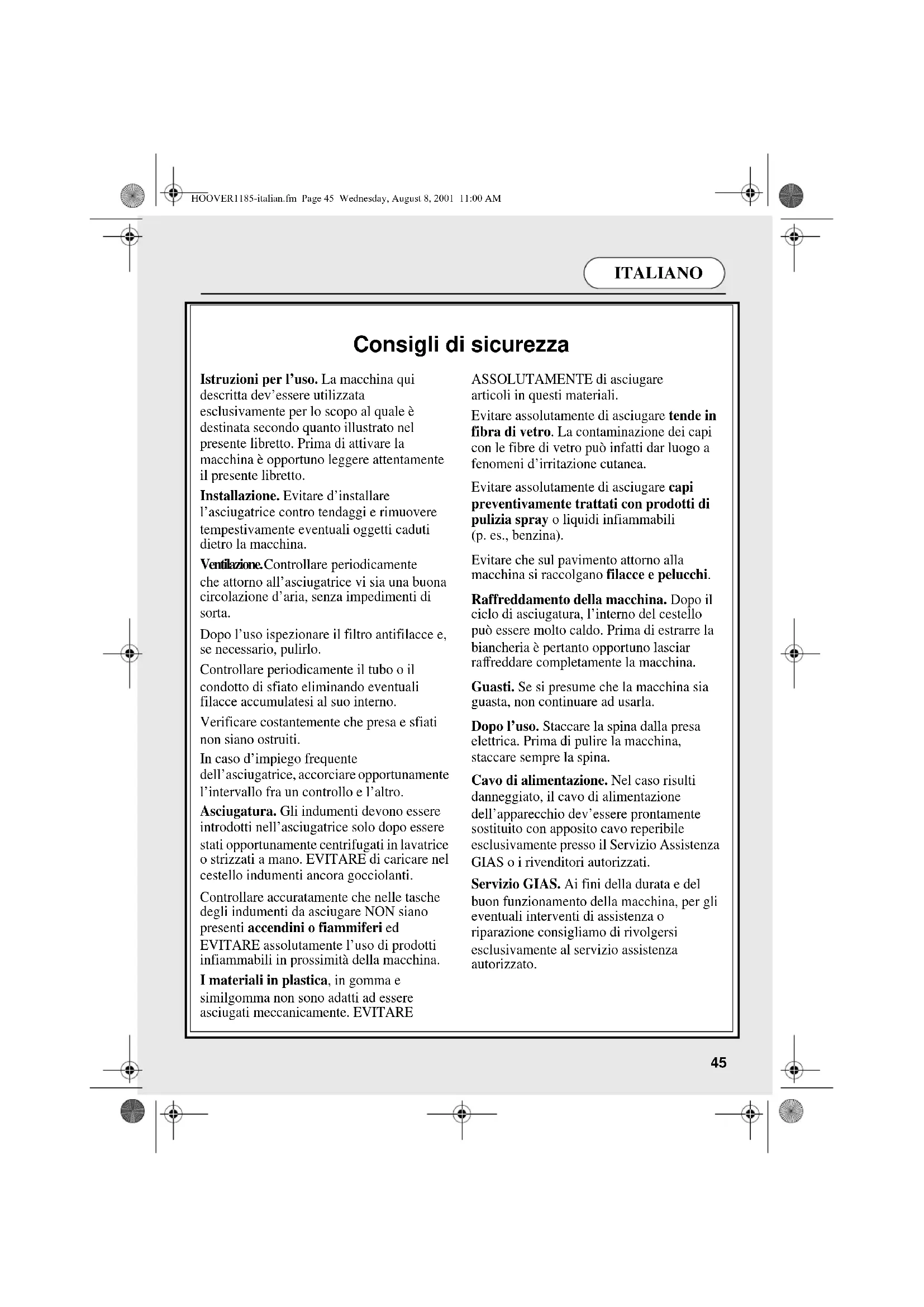 Consigli di sicurezza Istruzioni per l’uso. La macchina qui descritta dev’essere utilizzata esclusivamente per lo scopo al quale è destinata secondo quanto illustrato nel presente libretto. Prima di attivare la macchina è opportuno leggere attentamente il presente libretto. Installazione. Evitare d’installare l’asciugatrice contro tendaggi e rimuovere tempestivamente eventuali oggetti caduti dietro la macchina. Ventilazione. Controllare periodicamente che attorno all’asciugatrice vi sia una buona circolazione d’aria, senza impedimenti di sorta. Dopo l’uso ispezionare il filtro antifilacce e, se necessario, pulirlo. Controllare periodicamente il tubo o il condotto di sfiato eliminando eventuali filacce accumulatesi al suo interno. Verificare costantemente che presa e sfiati non siano ostruiti. In caso d’impiego frequente dell’asciugatrice, accorciare opportunamente l’intervallo fra un controllo e l’altro. Asciugatura. Gli indumenti devono essere introdotti nell’asciugatrice solo dopo essere stati opportunamente centrifugati in lavatrice o strizzati a mano. EVITARE di caricare nel cestello indumenti ancora gocciolanti. Controllare accuratamente che nelle tasche degli indumenti da asciugare NON siano presenti accendini o fiammiferi ed EVITARE assolutamente l’uso di prodotti infiammabili in prossimità della macchina. I materiali in plastica, in gomma e similgomma non sono adatti ad essere asciugati meccanicamente. EVITARE ASSOLUTAMENTE di asciugare articoli in questi materiali. Evitare assolutamente di asciugare tende in fibra di vetro. La contaminazione dei capi con le fibre di vetro può infatti dar luogo a fenomeni d’irritazione cutanea. Evitare assolutamente di asciugare capi preventivamente trattati con prodotti di pulizia spray o liquidi infiammabili (p. es., benzina). Evitare che sul pavimento attorno alla macchina si raccolgano filacce e pelucchi. Raffreddamento della macchina. Dopo il ciclo di asciugatura, l’interno del cestello può essere molto caldo. Prima di estrarre la biancheria è pertanto opportuno lasciar raffreddare completamente la macchina. Guasti. Se si presume che la macchina sia guasta, non continuare ad usarla. Dopo l’uso. Staccare la spina dalla presa elettrica. Prima di pulire la macchina, staccare sempre la spina. Cavo di alimentazione. Nel caso risulti danneggiato, il cavo di alimentazione dell’apparecchio dev’essere prontamente sostituito con apposito cavo reperibile esclusivamente presso il Servizio Assistenza GIAS o i rivenditori autorizzati. Servizio GIAS. Ai fini della durata e del buon funzionamento della macchina, per gli eventuali interventi di assistenza o riparazione consigliamo di rivolgersi esclusivamente al servizio assistenza autorizzato. HOOVER1185-italian.fm Page 45 Wednesday, August 8, 2001 11:00 AMITALIANO