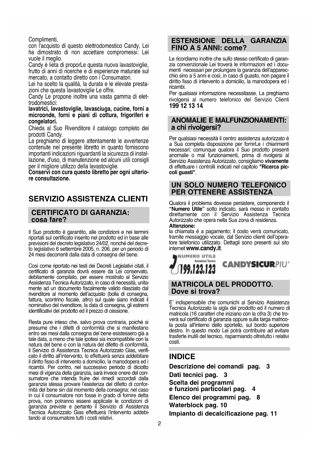 Qualora il problema dovesse persistere, componendo il “Numero Utile” sotto indicato, sarà messo in contatto direttamente con il Servizio Assistenza Tecnica Autorizzato che opera nella Sua zona di residenza. Attenzione: la chiamata è a pagamento; il costo verrà comunicato, tramite messaggio vocale, dal Servizio clienti dell’opera- tore telefonico utilizzato. Dettagli sono presenti sul sito internet www.candy.it. MATRICOLA DEL PRODOTTO. Dove si trova? E’ indispensabile che comunichi al Servizio Assistenza Tecnica Autorizzato la sigla del prodotto ed il numero di matricola (16 caratteri che iniziano con la cifra 3) che tro- verà sul certificato di garanzia oppure sulla targa matrico- la posta all'interno dello sportello, sul bordo superiore destro. In questo modo Lei potrà contribuire ad evitare trasferte inutili del tecnico, risparmiando oltretutto i relativi costi. INDICE Descrizione dei comandi pag. 3 Dati tecnici pag. 3 Scelta dei programmi e funzioni particolari pag. 4 Elenco dei programmi pag. 8 Waterblock pag. 10 Impianto di decalcificazione pag. 113 Coperti (EN 50242) Capacità con pentole e piatti Pressione ammessa nell'impianto idraulico Ampere fusibile Potenza max assorbita Tensione d’alimentazione