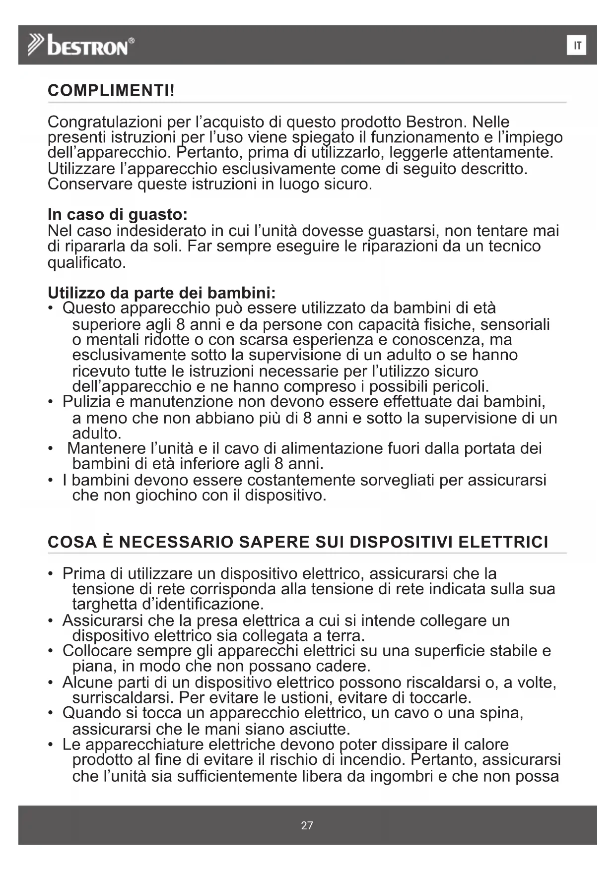 ENCOMPLIMENTI! Congratulazioni per l’acquisto di questo prodotto Bestron. Nelle presenti istruzioni per l’uso viene spiegato il funzionamento e l’impiego dell’apparecchio. Pertanto, prima di utilizzarlo, leggerle attentamente. Utilizzare l’apparecchio esclusivamente come di seguito descritto. Conservare queste istruzioni in luogo sicuro. In caso di guasto: Nel caso indesiderato in cui l’unità dovesse guastarsi, non tentare mai di ripararla da soli. Far sempre eseguire le riparazioni da un tecnico qualificato. Utilizzo da parte dei bambini: