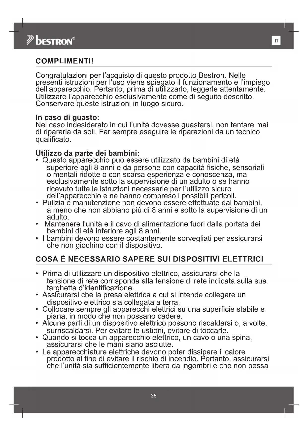 ENCOMPLIMENTI! Congratulazioni per l’acquisto di questo prodotto Bestron. Nelle presenti istruzioni per l’uso viene spiegato il funzionamento e l’impiego dell’apparecchio. Pertanto, prima di utilizzarlo, leggerle attentamente. Utilizzare l’apparecchio esclusivamente come di seguito descritto. Conservare queste istruzioni in luogo sicuro. In caso di guasto: Nel caso indesiderato in cui l’unità dovesse guastarsi, non tentare mai di ripararla da soli. Far sempre eseguire le riparazioni da un tecnico qualificato. Utilizzo da parte dei bambini: