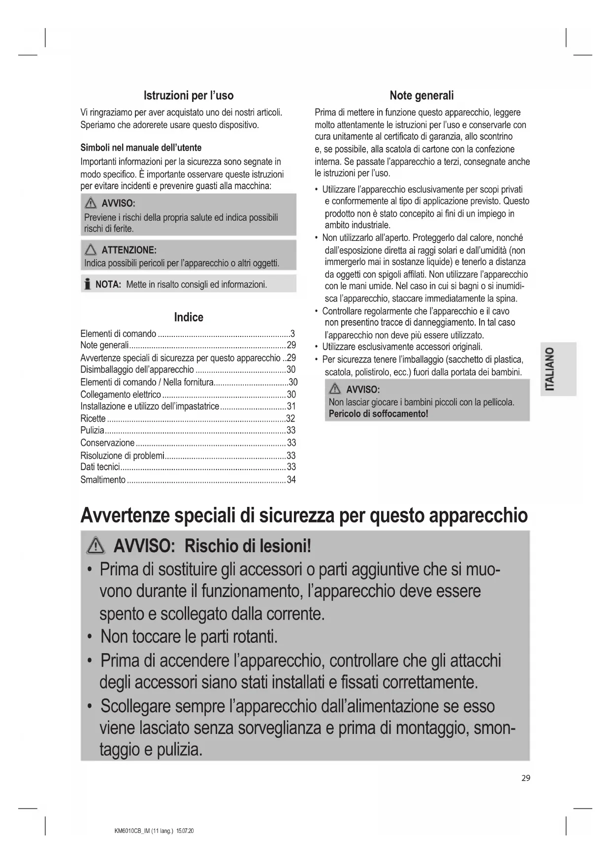 - Note generali Avvertenze speciali di sicurezza per questo apparecchio p. 29