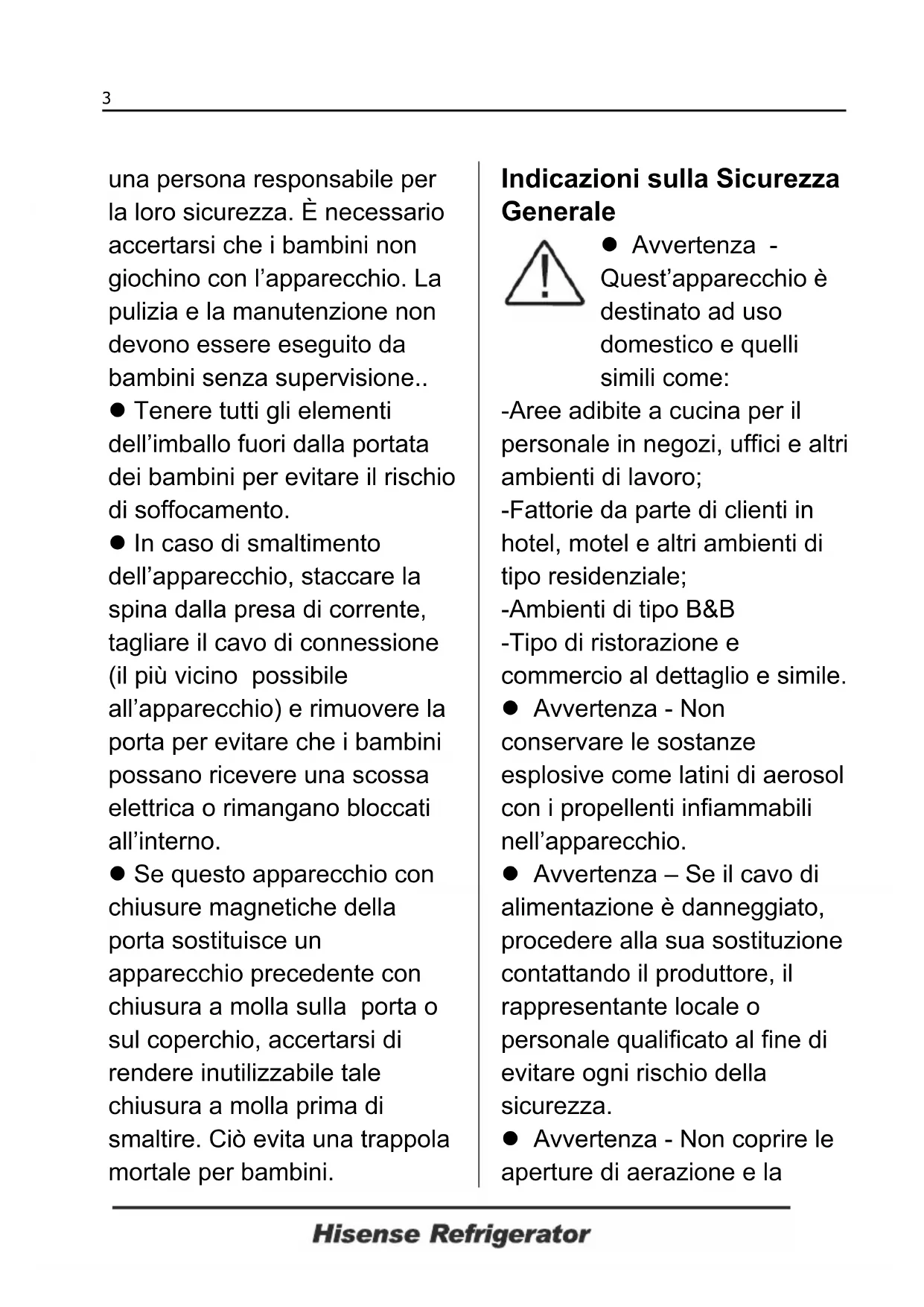 Élimination correcte de ce produit Ce marquage indique que le produit ne doit pas être éliminé avec les autres produits ménagers au sein de l’UE. Afin d’éviter de possible dégâts sur l’environnement ou sur la santé des humains, recyclez l’appareil de façon responsable pour promouvoir la réutilisation des matériaux. Pour retourner votre appareil utilisé, veuillez utiliser les systèm es de retour et de collecte ou contactez le revendeur chez qui vous avez acheté ce produit. Ils peuvent récupérer ce produit pour un recyclage respectueux de l’environnement.una persona responsabile per la loro sicurezza. È necessario accertarsi che i bambini non giochino con l’apparecchio. La pulizia e la manutenzione non devono essere eseguito da bambini senza supervisione.. z Tenere tutti gli elementi dell’imballo fuori dalla portata dei bambini per evitare il rischio di soffocamento. z In caso di smaltimento dell’apparecchio, staccare la spina dalla presa di corrente, tagliare il cavo di connessione (il più vicino possibile all’apparecchio) e rimuovere la porta per evitare che i bambini possano ricevere una scossa elettrica o rimangano bloccati all’interno. z Se questo apparecchio con chiusure magnetiche della porta sostituisce un apparecchio precedente con chiusura a molla sulla porta o sul coperchio, accertarsi di rendere inutilizzabile tale chiusura a molla prima di smaltire. Ciò evita una trappola mortale per bambini. Indicazioni sulla Sicurezza Generale z Avvertenza - Quest’apparecchio è destinato ad uso domestico e quelli simili come: -Aree adibite a cucina per il personale in negozi, uffici e altri ambienti di lavoro; -Fattorie da parte di clienti in hotel, motel e altri ambienti di tipo residenziale; -Ambienti di tipo B&B -Tipo di ristorazione e commercio al dettaglio e simile. z Avvertenza - Non conservare le sostanze esplosive come latini di aerosol con i propellenti infiammabili nell’apparecchio. z Avvertenza – Se il cavo di alimentazione è danneggiato, procedere alla sua sostituzione contattando il produttore, il rappresentante locale o personale qualificato al fine di evitare ogni rischio della sicurezza. z Avvertenza - Non coprire le aperture di aerazione e la 3ritiene fuori di ostruzione. z Avvertenza - Si raccomanda di non usare dispositivi meccanici o altri mezzi per accelerare il processo di sbrinamento, diversi da quelli raccomandati dal produttore. z Avvertenza - Non danneggiare il circuito refrigerante. z Avvertenza - Non accendere apparecchi elettrici all’interno dei compartimenti degli alimenti, a meno che ciò non sia raccomandato dal produttore. z Avvertenza – Il refrigerante e gas isolato sono infiammabili. Quando smaltisce l’apparecchio farlo solo in centro di smaltimento dei rifiuti autorizzati. Non esporla a fiamme. Frigorifero Il frigorifero contiene una piccola quantità di refrigerante isobutene (R600a) nel circuito refrigerante, che è un gas naturale con alta compatibilità ambientale ma infiammabile. Assicurare che ciascuno dei componenti non viene danneggiato durante il trasporto o l’ installazione. Il refrigerante (R600a) è infiammabile. Attenzione: rischio di incendio