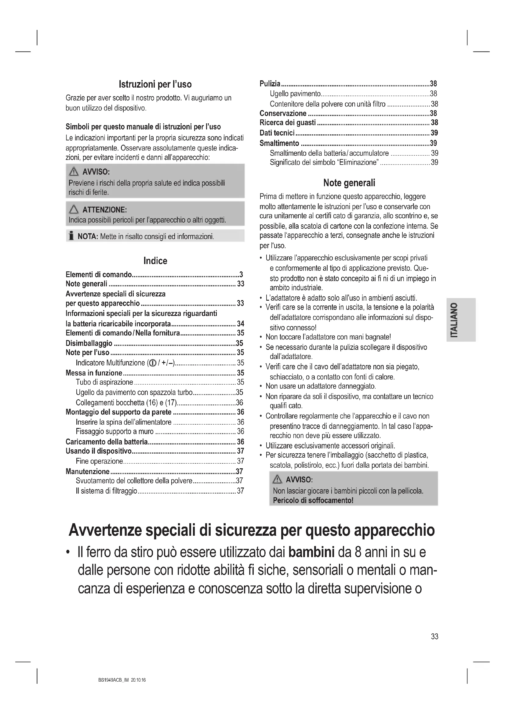 - Pulizia e manutenzione non devono essere eseguiti da bambini senza supervisione.