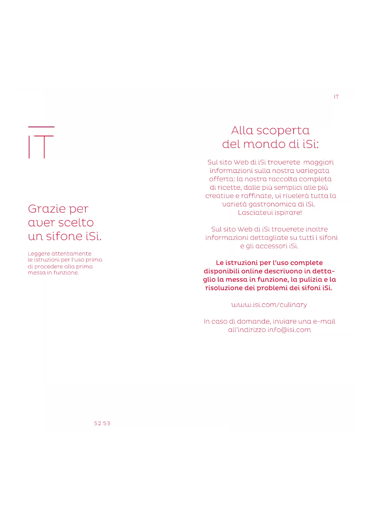 Alla scoperta del mondo di iSi: Sul sito Web di iSi troverete maggiori informazioni sulla nostra variegata offerta: la nostra raccolta completa di ricette, dalle più semplici alle più creative e raffinate, vi rivelerà tutta la varietà gastronomica di iSi. Lasciatevi ispirare! Sul sito Web di iSi troverete inoltre informazioni dettagliate su tutti i sifoni e gli accessori iSi. Le istruzioni per l’uso complete disponibili online descrivono in detta- glio la messa in funzione, la pulizia e la risoluzione dei problemi dei sifoni iSi. www.isi.com/culinary In caso di domande, inviare una e-mail all’indirizzo info@isi.com54 55 Qualità garantita: Ogni sifone iSi viene controllato minuziosamen- te in fabbrica. iSi offre una garanzia di 2 anni sui materiali e sulla lavorazione, purché non siano insorti difetti dovuti a uso improprio. La validità della garanzia decorre dalla data della ricevuta d’acquisto. Registratevi ora e otterrete l’estensione della garanzia! I vantaggi di cui godrete: 3 anni di garanzia sul materiale e sulla lavorazione e 5 anni di garan- zia sull’isolamento del corpo bottiglia termico. La garanzia è valida solo se si utilizzano com- ponenti originali per sifoni iSi secondo l’elenco dei componenti del prodotto. Si garantisce un funzionamento regolare del sifone solo se, inol- tre, vengono utilizzate esclusivamente capsule iSi. Non sussiste alcun diritto di garanzia o di responsabilità per difetti, danni diretti e indiret- ti causati in particolare dal mancato rispetto e/o dalla mancata lettura delle istruzioni per l’uso e delle relative avvertenze di sicurezza. Per avere questi vantaggi basta registrarsi su: www.isi.com/warranty