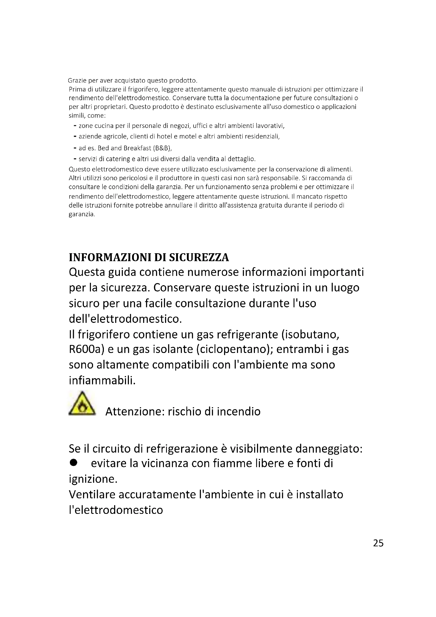 Questa guida contiene numerose informazioni importanti per la sicurezza. Conservare queste istruzioni in un luogo sicuro per una facile consultazione durante l'uso dell'elettrodomestico. Il frigorifero contiene un gas refrigerante (isobutano, R600a) e un gas isolante (ciclopentano); entrambi i gas sono altamente compatibili con l'ambiente ma sono infiammabili. Attenzione: rischio di incendio Se il circuito di refrigerazione è visibilmente danneggiato: evitare la vicinanza con fiamme libere e fonti di ignizione. Ventilare accuratamente l'ambiente in cui è installato l'elettrodomestico26 AVVERTENZA! Durate le operazioni di pulizia o trasporto dell'elettrodomestico, fare attenzione a non toccare i cavi metallici del condensatore sul retro dell'elettrodomestico per evitare di ferirsi le dita e le mani o di danneggiare il prodotto. Questo elettrodomestico non può essere impilato con altri elettrodomestici. Non sedersi né salire sull'elettrodomestico. Non è progettato per simili utilizzi. Ci si potrebbe ferire o l'elettrodomestico potrebbe danneggiarsi. Accertarsi che il cavo di alimentazione non resti impigliato sotto l'apparecchiatura per evitare che si laceri o si danneggi. Quando l'elettrodomestico viene posizionato, fare attenzione a non danneggiare il pavimento, i tubi, il rivestimento delle pareti ecc. Non spostare l'elettrodomestico tirandolo per il coperchio o per la maniglia. Non consentire ai bambini di giocare con l'apparecchio o manomettere i controlli. In caso di inosservanza delle istruzioni, l'azienda declina qualunque responsabilità. Non installare l'elettrodomestico in luoghi umidi, unti o polverosi, e non esporlo all'acqua e alla luce solare diretta. Non installare l'elettrodomestico accanto a caloriferi o materiali infiammabili.27 In caso di interruzione della corrente, non aprire il coperchio. Se il blackout non supera le 20 ore, gli alimenti congelati non dovrebbero subire alterazioni. Se l'interruzione della corrente dura di più, controllare il cibo e consumarlo immediatamente o ricongelarlo solo dopo averlo cotto. Se il coperchio del congelatore orizzontale non si riapre facilmente subito dopo che è stato chiuso, non si tratta di un problema, in quanto tale condizione dipende dalla differenza di pressione che si bilancerà entro pochi minuti consentendo nuovamente l'apertura del coperchio. Collegare l'elettrodomestico all'alimentazione elettrica solo dopo aver tolto l'imballo e le protezioni per il trasporto. Prima di accendere l'elettrodomestico, attendere almeno 4 ore per consentire all'olio del compressore di assestarsi nel caso in cui l'elettrodomestico sia stato trasportato in posizione orizzontale. Utilizzare il congelatore solo per gli scopi previsti, ossia la conservazione e il congelamento di alimenti.28 Non conservare medicinali o materiali di ricerca nelle cantinette. Non conservare medicinali o materiali di ricerca che richiedano un controllo rigido della temperatura di conservazione, in quanto potrebbero deteriorarsi e provocare reazioni incontrollate e pericolose. Prima di qualunque intervento, scollegare il cavo di alimentazione dalla presa elettrica. Quando il prodotto viene consegnato, accertarsi che non sia danneggiato e che tutti i componenti e gli accessori siano in perfette condizioni. In caso di perdita nell'impianto di refrigerazione, non toccare la presa di corrente ed evitare l'uso di fiamme libere. Aprire la finestra e arieggiare l'ambiente. Rivolgersi al centro assistenza per chiedere la riparazione. Non adoperare adattatori né cavi di prolunga. Non tirare o piegare eccessivamente il cavo di alimentazione e non toccare la spina con le mani umide. Per scongiurare il rischio di incendi o scosse elettriche, non danneggiare la spina e/o il cavo di alimentazione. Se il cavo di alimentazione dell’elettrodomestico dovesse essere danneggiato, farlo sostituire dal produttore, dal suo servizio tecnico o da un tecnico qualificato, per evitare rischi.29 Non collocare o conservare materiali infiammabili o estremamente volatili (ad es. etere, benzina, GPL, propano, bombolette per aerosol, adesivi, alcool puro), in quanto possono provocare esplosioni. Non adoperare né conservare spray infiammabili (ad es. bombolette di vernice spray) accanto alle cantinette, in quanto potrebbero svilupparsi incendi o esplosioni. Non collocare oggetti e/o contenitori pieni d'acqua sopra l'elettrodomestico. Si sconsiglia l'uso di prolunghe e prese multiple. Non smaltire l'elettrodomestico nel fuoco. Fare attenzione a non danneggiare il circuito/i tubi di raffreddamento dell'elettrodomestico durante il trasporto e l'uso. In caso di danni, non esporre l'elettrodomestico al fuoco o a potenziali fonti di ignizione, e ventilare immediatamente l'ambiente in cui è installato. L'impianto di refrigerazione collocato nella parte posteriore e nella parte interna delle cantinette contiene refrigerante, per cui occorre particolare attenzione a non danneggiare i tubi. Non adoperare apparecchiature elettriche all'interno dei comparti dell'elettrodomestico destinati alla conservazione degli alimenti, a meno che non siano del tipo consigliato dal produttore. Non danneggiare il circuito di refrigerazione.30 Non usare oggetti meccanici o utensili diversi da quelli consigliati dal produttore per accelerare lo sbrinamento. Non adoperare apparecchiature elettriche all'interno dei comparti per la conservazione degli alimenti, a meno che non siano del tipo consigliato dal produttore. Tenere libere da ostruzioni le aperture di ventilazione sull'involucro del frigorifero. Non toccare gli elementi di raffreddamento interni, soprattutto con le mani bagnate, per evitare bruciature o lesioni. Non adoperare oggetti appuntiti o affilati (ad es. coltelli o forchette) per rimuovere il ghiaccio. Non utilizzare asciugacapelli, stufe o apparecchi simili per lo sbrinamento. Non adoperare coltelli o oggetti appuntiti per rimuovere brina o ghiaccio. Il circuito del refrigerante potrebbe danneggiarsi ed 