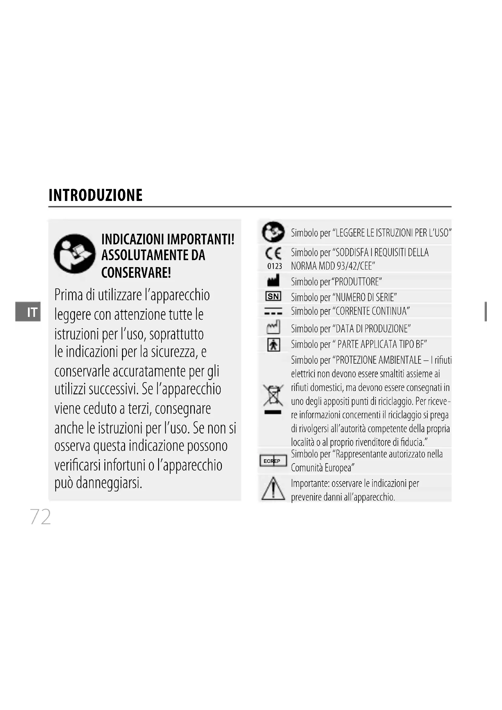 Simbolo per “NUMERO DI SERIE” Simbolo per “CORRENTE CONTINUA” Simbolo per “DATA DI PRODUZIONE” Simbolo per “ PARTE APPLICATA TIPO BF” Simbolo per “PROTEZIONE AMBIENTALE – I rifiuti elettrici non devono essere smaltiti assieme ai rifiuti domestici, ma devono essere consegnati in uno degli appositi punti di riciclaggio. Per riceve