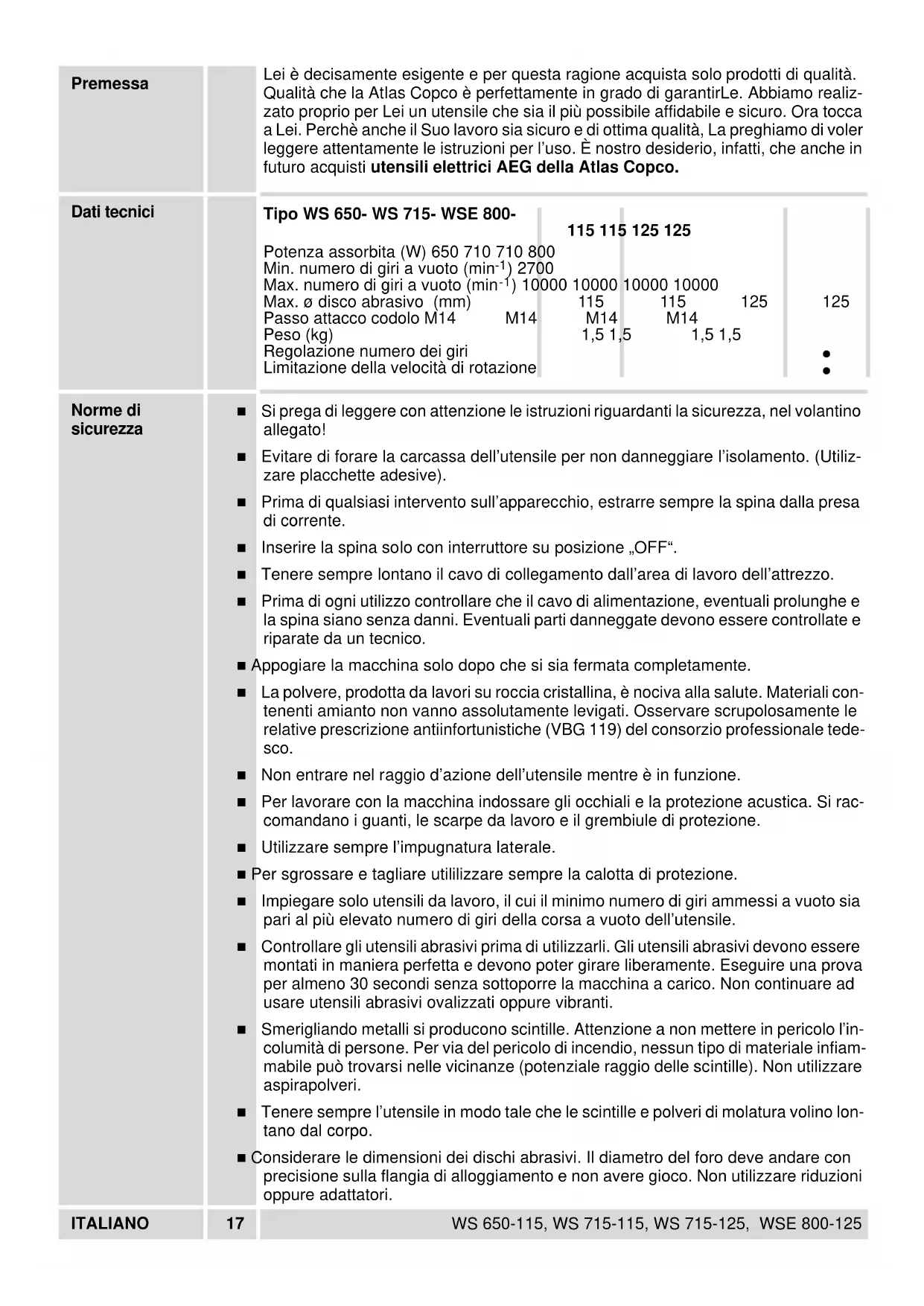2ITALIANO 19 WS 650-115, WS 715-115, WS 715-125, WSE 800-125 Descrizione Modifiche: Testo, figure e dati corrispondono allo standard tecnico aggiornato all’epoca della stampa. Ci riserviamo pertanto eventuali modifiche tecniche dovute all’ulteriore sviluppo dei nostri prodotti. Blocco albero Freccia senso di rotazione Molla di fissaggio Albero porta utensili Calotta di protezione con arresto di fine corsa e tac- che interne di guida posi- zione Flangia di tensione FIXTEC - Dado di serrag- gio veloce Dado flangiato Chiave per dadi a due fori Rotella di regolazione del numero di giri (solo per i tipi WSE 800) Interruttore con bloccaggio Impugnatura supplementare Dado di serraggio Foglio abrasivo Platorello Limitazione della velocità di rotazione nella corsa a vuoto per corsa silenziosa (solo per i tipi WSE 800) Numero costante di giri anche in caso di alterazione della potenza del motore grazie all’elettronica co- stante. (solo per i tipi WSE 800) Utensile di lavoroITALIANO 20 WS 650-115, WS 715-115, WS 715-125, WSE 800-125 Elettronica L’elettronica regola l’assorbimento di corrente in base al carico. Il numero di giri potrebbe essere influenzato da causali interferenze elettromagneti- che esterne. Scelta della potenza Preselezione velocità con selettore: A= velocità minima G= velocità massima Montaggio della calotta di protezione Inserire la calotta di protezione come mostrato in illustrazione. Girare la calotta di protezione fino a che la molla regolatrice si sia bloccata dopo l’arresto. La calot- ta di protezione può essere girata nell’ambito di entrambe le posizioni di arresto. Per togliere la calotta di protezione sollevare leg- germente la molla regolatrice con una maniglia a vite e portare la calotta di protezione nella posizio- ne iniziale. Sfilare quindi la calotta di protezione. Fissaggio dell’utensile da lavoro Prima di qualsiasi intervento sull’apparecchio, estrarre sempre la spina dalla presa di corrente. Verificare l’albero porta utensili tramite una pres- sione sull’arresto albero. Montare la flangia di ten- sione dell’utensile da lavoro e il mandrino flangiato conformemente all’illustrazione. FIXTEC - Dado di serraggio veloce Tramite il FIXTEC è possibile serrare e allentare il dado di serraggio veloce con una sola mano. Non capovolgere l’utensile.