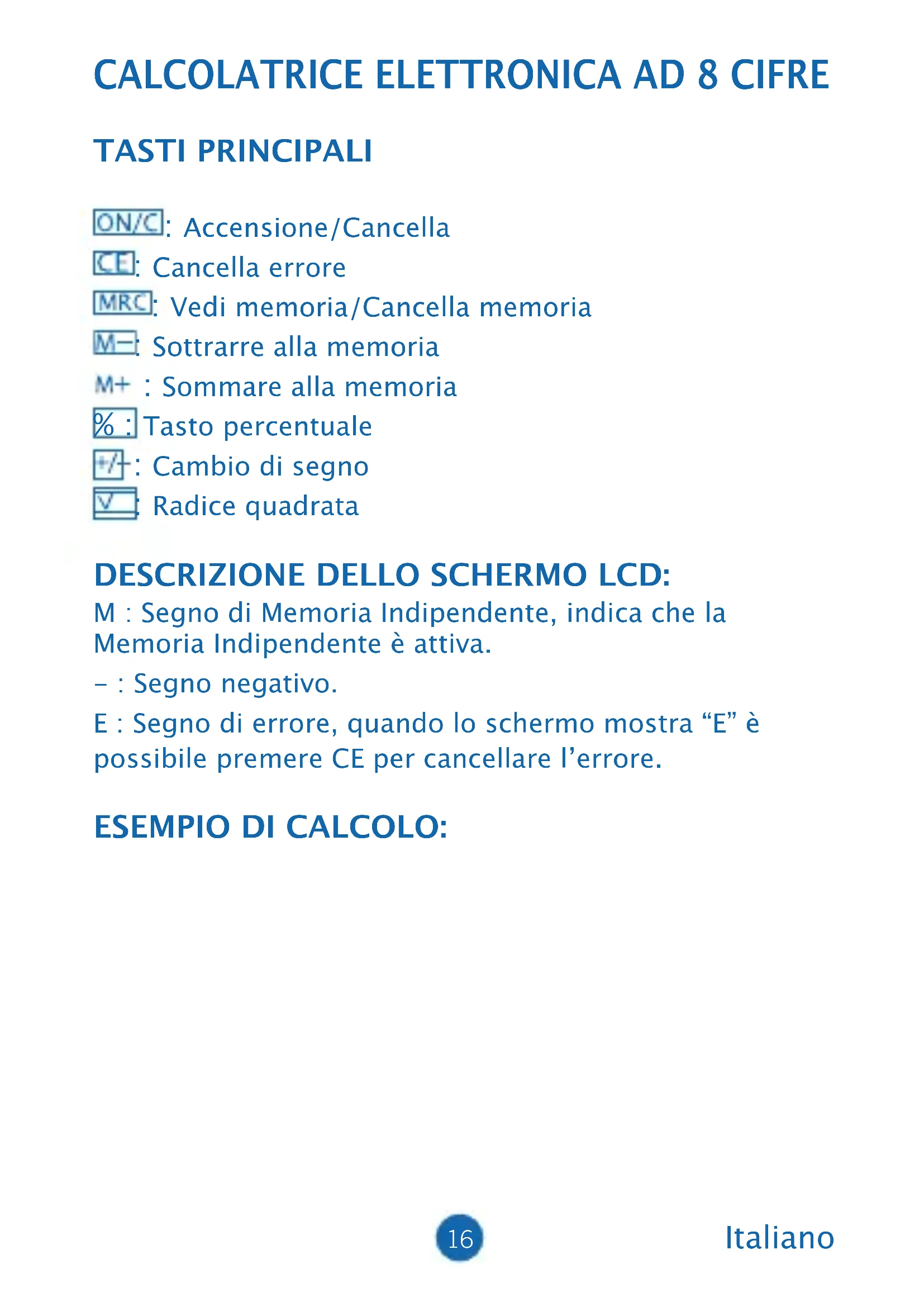 TASTI PRINCIPALI : Accensione/Cancella : Cancella errore : Vedi memoria/Cancella memoria : Sottrarre alla memoria : Sommare alla memoria % : Tasto percentuale : Cambio di segno : Radice quadrata DESCRIZIONE DELLO SCHERMO LCD: M : Segno di Memoria Indipendente, indica che la Memoria Indipendente è attiva. - : Segno negativo. E : Segno di errore, quando lo schermo mostra “E” è possibile premere CE per cancellare l’errore. ESEMPIO DI CALCOLO: Italiano17 ON/C 5+6M 32-6M+ 36+17M- MRC