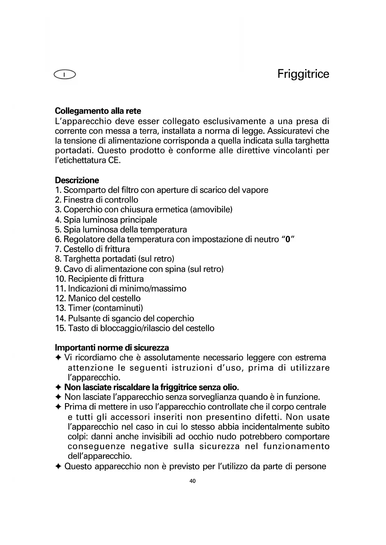 Importanti norme di sicurezza ✦ Vi ricordiamo che è assolutamente necessario leggere con estrema attenzione le seguenti istruzioni d’uso, prima di utilizzare l’apparecchio. ✦ Non lasciate riscaldare la friggitrice senza olio. ✦ Non lasciate l’apparecchio senza sorveglianza quando è in funzione. ✦ Prima di mettere in uso l’apparecchio controllate che il corpo centrale e tutti gli accessori inseriti non presentino difetti. Non usate l’apparecchio nel caso in cui lo stesso abbia incidentalmente subito colpi: danni anche invisibili ad occhio nudo potrebbero comportare conseguenze negative sulla sicurezza nel funzionamento dell’apparecchio. ✦ Questo apparecchio non è previsto per l’utilizzo da parte di persone