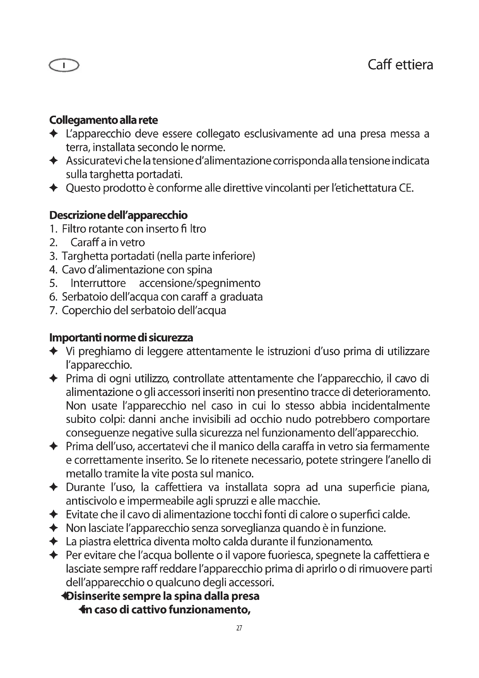 Importanti norme di sicurezza Vi preghiamo di leggere attentamente le istruzioni d’uso prima di utilizzare ✦ l’apparecchio. Prima di ogni utilizzo, controllate attentamente che l’apparecchio, il cavo di ✦ alimentazione o gli accessori inseriti non presentino tracce di deterioramento. Non usate l’apparecchio nel caso in cui lo stesso abbia incidentalmente subito colpi: danni anche invisibili ad occhio nudo potrebbero comportare conseguenze negative sulla sicurezza nel funzionamento dell’apparecchio. Prima dell’uso, accertatevi che il manico della cara a in vetro sia fermamente ✦ e correttamente inserito. Se lo ritenete necessario, potete stringere l’anello di metallo tramite la vite posta sul manico. Durante l’uso, la ca ettiera va installata sopra ad una super cie piana, ✦ antiscivolo e impermeabile agli spruzzi e alle macchie. Evitate che il cavo di alimentazione tocchi fonti di calore o super ci calde. ✦ Non lasciate l’apparecchio senza sorveglianza quando è in funzione. ✦ La piastra elettrica diventa molto calda durante il funzionamento. ✦ Per evitare che l’acqua bollente o il vapore fuoriesca, spegnete la ca ettiera e ✦ lasciate sempre ra reddare l’apparecchio prima di aprirlo o di rimuovere parti dell’apparecchio o qualcuno degli accessori. Disinserite sempre la spina dalla presa ✦ in caso di cattivo funzionamento, ✦