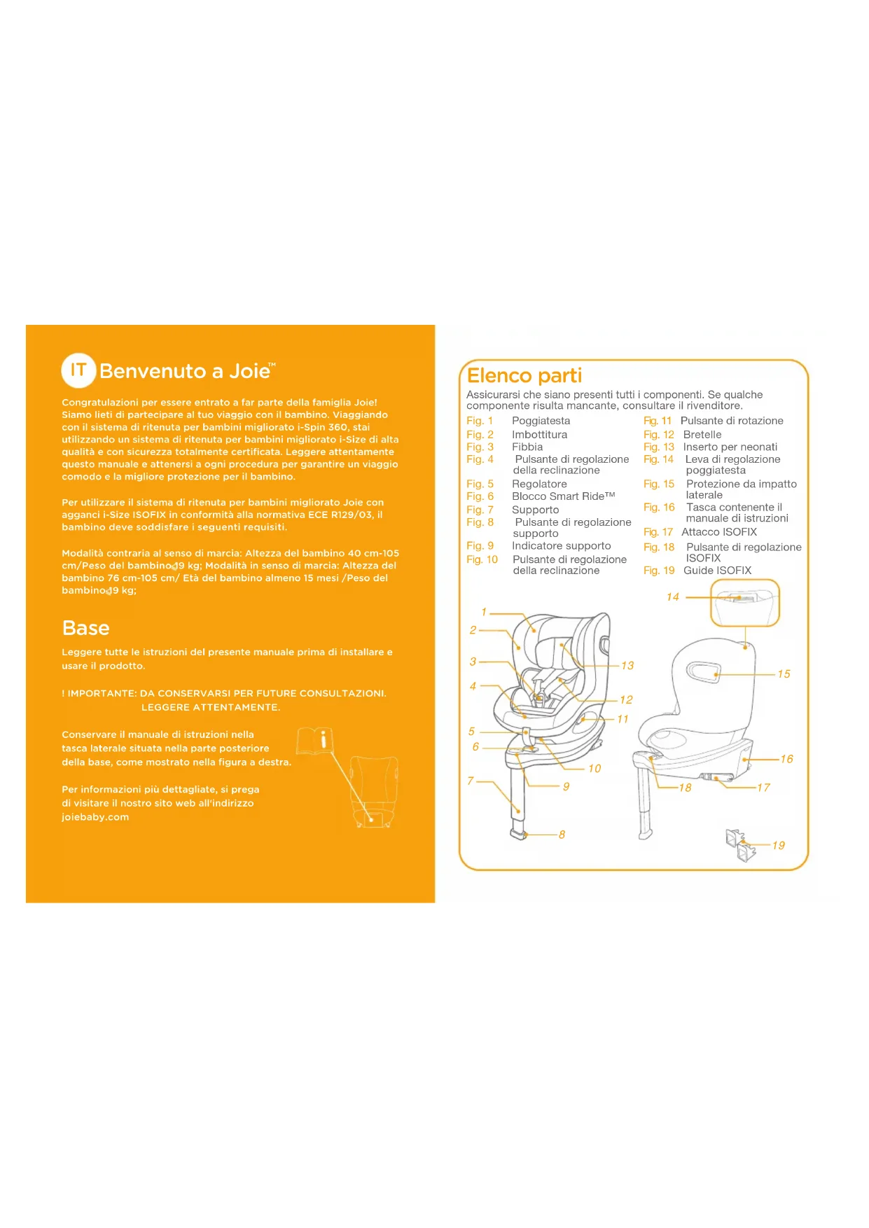 Congratulazioni per essere entrato a far parte della famiglia Joie! Siamo lieti di partecipare al tuo viaggio con il bambino. Viaggiando con il sistema di ritenuta per bambini migliorato i-Spin 360, stai utilizzando un sistema di ritenuta per bambini migliorato i-Size di alta qualità e con sicurezza totalmente certificata. Leggere attentamente questo manuale e attenersi a ogni procedura per garantire un viaggio comodo e la migliore protezione per il bambino.Per utilizzare il sistema di ritenuta per bambini migliorato Joie con agganci i-Size ISOFIX in conformità alla normativa ECE R129/03, il bambino deve soddisfare i seguenti requisiti.Modalità contraria al senso di marcia: Altezza del bambino 40 cm-105 cm/Peso del bambino 19 kg; Modalità in senso di marcia: Altezza del bambino 76 cm-105 cm/ Età del bambino almeno 15 mesi /Peso del bambino 19 kg; Base Leggere tutte le istruzioni del presente manuale prima di installare e usare il prodotto.! IMPORTANTE: DA CONSERVARSI PER FUTURE CONSULTAZIONI.LEGGERE ATTENTAMENTE.Conservare il manuale di istruzioni nella tasca laterale situata nella parte posteriore della base, come mostrato nella figura a destra.Per informazioni più dettagliate, si prega di visitare il nostro sito web all'indirizzo joiebaby.com Elenco parti Fig. 1 PoggiatestaFig. 2 ImbottituraFig. 3 FibbiaFig. 4 Pulsante di regolazione della reclinazione Fig. 5 RegolatoreFig. 6 Blocco Smart Ride™Fig. 7 SupportoFig. 8 Pulsante di regolazione supportoFig. 9 Indicatore supportoFig. 10 Pulsante di regolazione della reclinazioneFig. 11 Pulsante di rotazioneFig. 12 BretelleFig. 13 Inserto per neonatiFig. 14 Leva di regolazione poggiatestaFig. 15 Protezione da impatto lateraleFig. 16 Tasca contenente il manuale di istruzioniFig. 17 Attacco ISOFIXFig. 18 Pulsante di regolazione ISOFIXFig. 19 Guide ISOFIXAssicurarsi che siano presenti tutti i componenti. Se qualche componente risulta mancante, consultare il rivenditore.