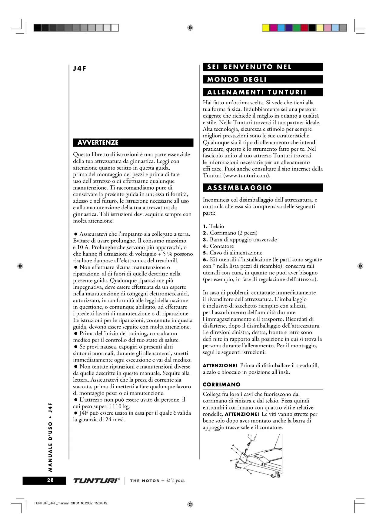 - -10 % Motore ,75 HP Tutti i modelli Tunturi sono stati progettati in conformità delle direttive dell'Unione Europea circa i congegni elettromagnetici, EMC (89/336/ CEE) e materialie elettrico destinato all'uso nell'ambito di determinati limiti di tensione (73/23/CEE) e possono perciò portare affi sso il marchio di conformità CE. A causa di una politica volta a un continuo sviluppo del prodotto, la Tunturi si riserva il diritto di effettuare cambiamenti nelle caratteristiche degli attrezzi, senza darne relativo preavviso. ATTENZIONE! La garanzia non copre danni derivanti da inosservanza, nel montaggio, regolazione e manutenzione, delle istruzioni fornite nella presente guida. Le istruzioni per montaggio, uso e manutenzione della tua attrezzatura, devono essere seguite con molta cura. Non rispondiamo di cambi o modifi che non expressamente approvate da Tunturi Oy Ltd. Ti auguriamo di avere la gioia di fare tanti allenamenti, insieme al tuo nuovo amico Tunturi! TUNTURI_J4F_manual 36 31.10.2002, 15:34:5737 p. 1