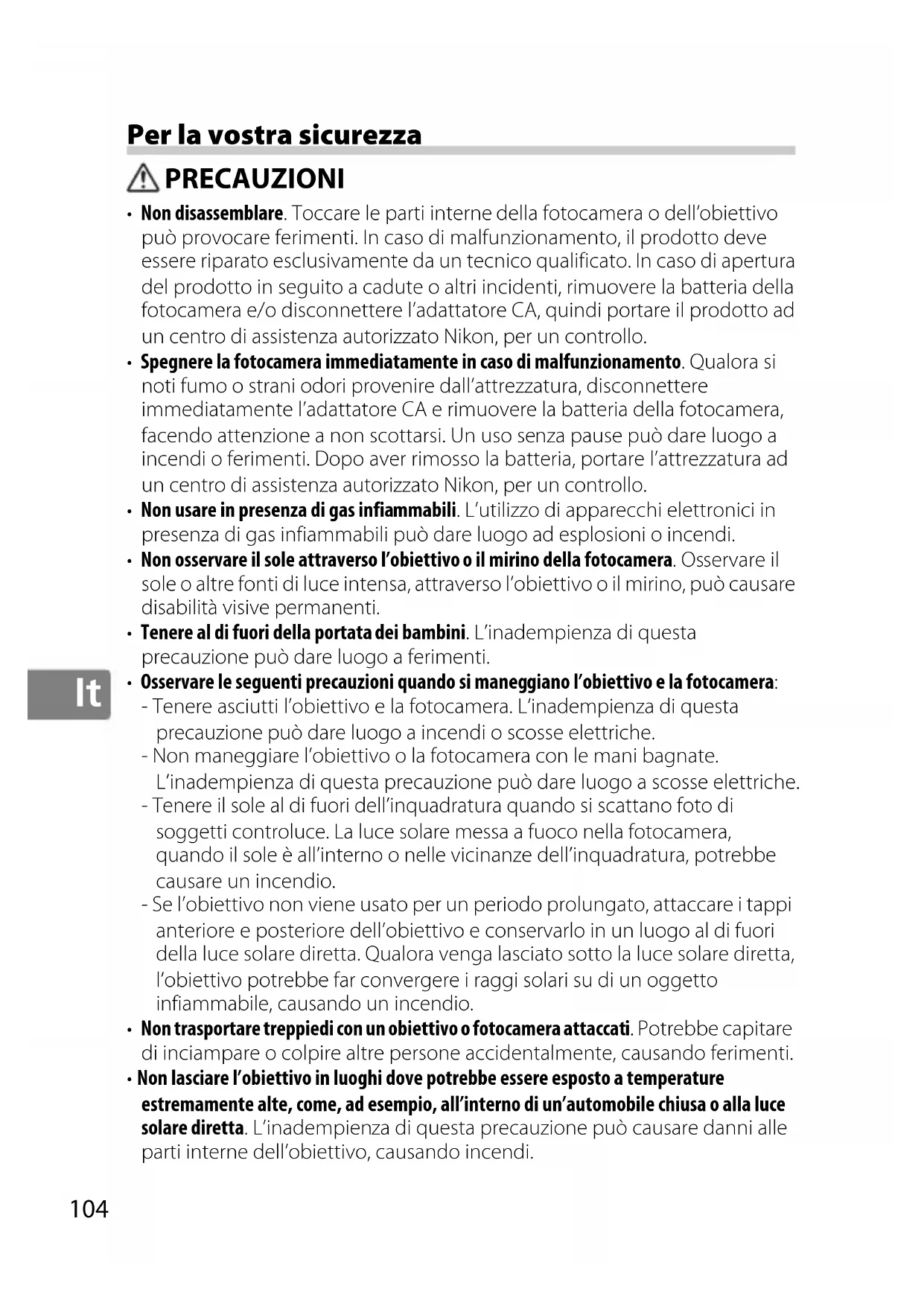 - Non disassemblare. Toccare le parti interne della fotocamera o dell’obiettivo può provocare ferimenti. In caso di malfunzionamento, il prodotto deve essere riparato esclusivamente da un tecnico qualificato. In caso di apertura del prodotto in seguito a cadute o altri incidenti, rimuovere la batteria della fotocamera e/o disconnettere l’adattatore CA, quindi portare il prodotto ad un centro di assistenza autorizzato Nikon, per un controllo.