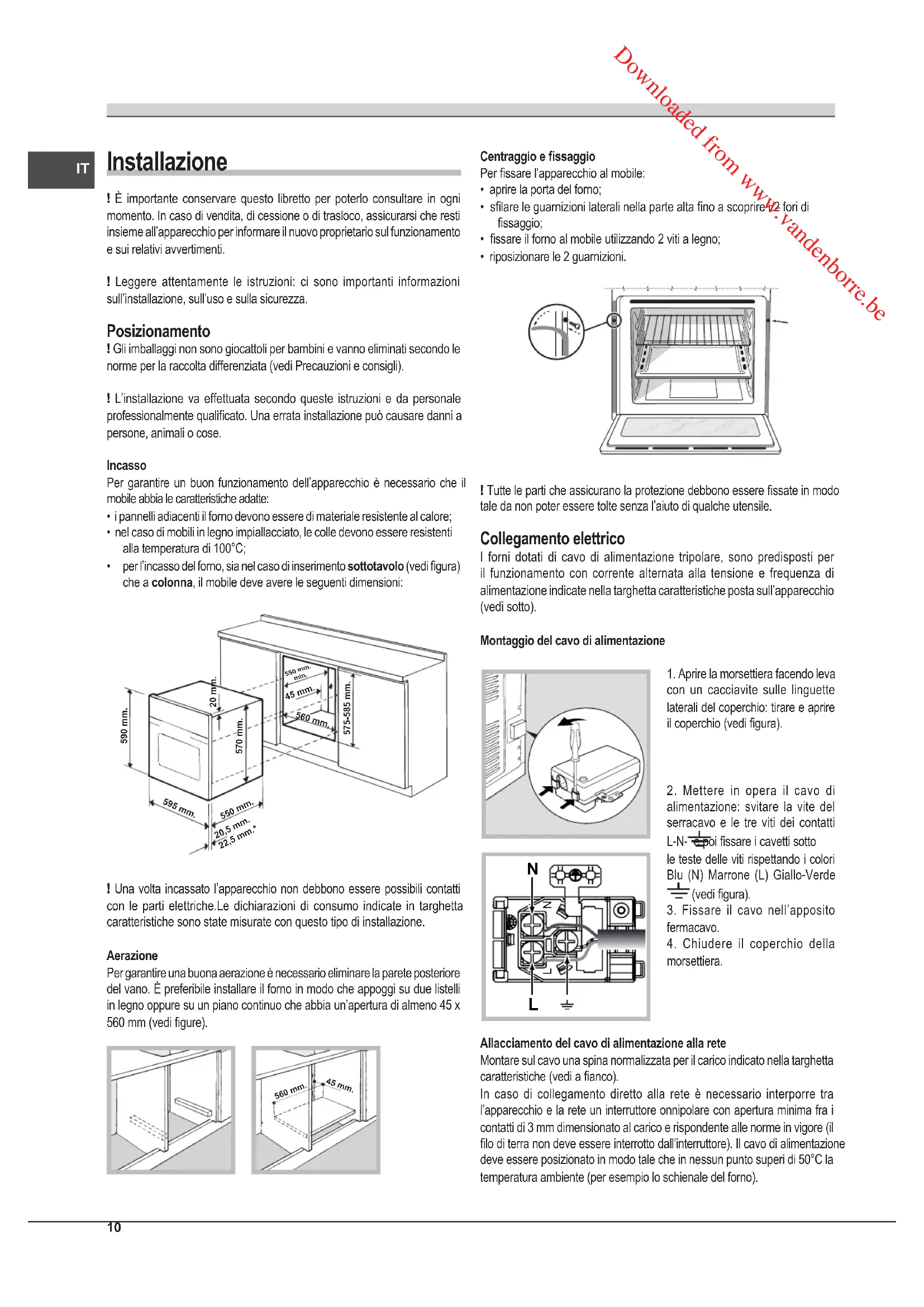 morsettiera. Allacciamento del cavo di alimentazione alla rete Montare sul cavo una spina normalizzata per il carico indicato nella targhetta caratteristiche (vedi a anco). In caso di collegamento diretto alla rete è necessario interporre tra l’apparecchio e la rete un interruttore onnipolare con apertura minima fra i contatti di 3 mm dimensionato al carico e rispondente alle norme in vigore (il lo di terra non deve essere interrotto dall’interruttore). Il cavo di alimentazione deve essere posizionato in modo tale che in nessun punto superi di 50°C la temperatura ambiente (per esempio lo schienale del forno).