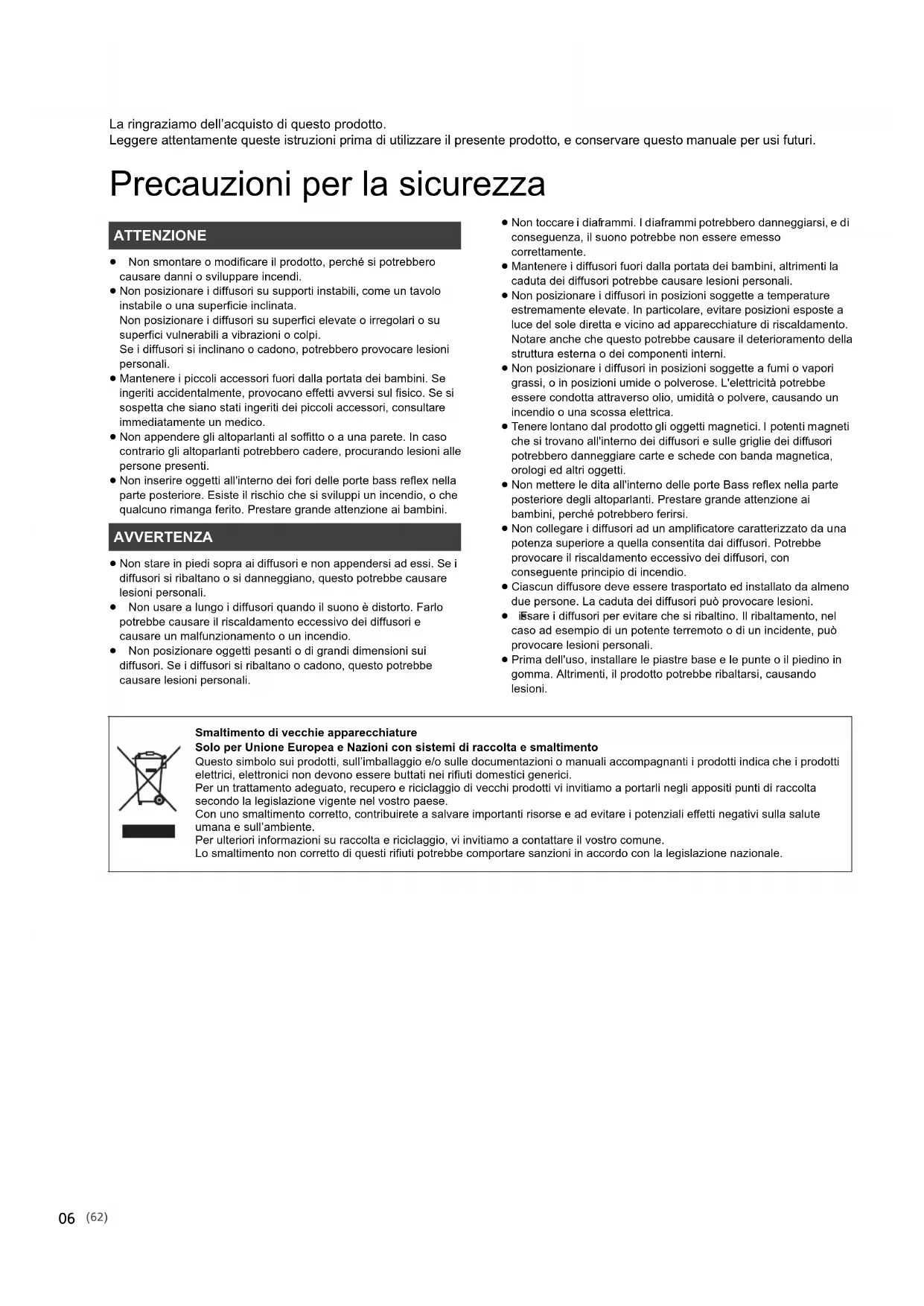 SB-G90_TQBM0081_PPCEBEGGN_mst.book 19 ページ 2017年2月10日 金曜日 午前10時39分La ringraziamo dell’acquisto di questo prodotto. Leggere attentamente queste istruzioni prima di utilizzare il presente prodotto, e conservare questo manuale per usi futuri. Precauzioni per la sicurezza ≥ Non smontare o modificare il prodotto, perché si potrebbero causare danni o sviluppare incendi. ≥ Non posizionare i diffusori su supporti instabili, come un tavolo instabile o una superficie inclinata. Non posizionare i diffusori su superfici elevate o irregolari o su superfici vulnerabili a vibrazioni o colpi. Se i diffusori si inclinano o cadono, potrebbero provocare lesioni personali. ≥ Mantenere i piccoli accessori fuori dalla portata dei bambini. Se ingeriti accidentalmente, provocano effetti avversi sul fisico. Se si sospetta che siano stati ingeriti dei piccoli accessori, consultare immediatamente un medico. ≥ Non appendere gli altoparlanti al soffitto o a una parete. In caso contrario gli altoparlanti potrebbero cadere, procurando lesioni alle persone presenti. ≥ Non inserire oggetti all'interno dei fori delle porte bass reflex nella parte posteriore. Esiste il rischio che si sviluppi un incendio, o che qualcuno rimanga ferito. Prestare grande attenzione ai bambini. ≥ Non stare in piedi sopra ai diffusori e non appendersi ad essi. Se i diffusori si ribaltano o si danneggiano, questo potrebbe causare lesioni personali. ≥ Non usare a lungo i diffusori quando il suono è distorto. Farlo potrebbe causare il riscaldamento eccessivo dei diffusori e causare un malfunzionamento o un incendio. ≥ Non posizionare oggetti pesanti o di grandi dimensioni sui diffusori. Se i diffusori si ribaltano o cadono, questo potrebbe causare lesioni personali. ≥ Non toccare i diaframmi. I diaframmi potrebbero danneggiarsi, e di conseguenza, il suono potrebbe non essere emesso correttamente. ≥ Mantenere i diffusori fuori dalla portata dei bambini, altrimenti la caduta dei diffusori potrebbe causare lesioni personali. ≥ Non posizionare i diffusori in posizioni soggette a temperature estremamente elevate. In particolare, evitare posizioni esposte a luce del sole diretta e vicino ad apparecchiature di riscaldamento. Notare anche che questo potrebbe causare il deterioramento della struttura esterna o dei componenti interni. ≥ Non posizionare i diffusori in posizioni soggette a fumi o vapori grassi, o in posizioni umide o polverose. L'elettricità potrebbe essere condotta attraverso olio, umidità o polvere, causando un incendio o una scossa elettrica. ≥ Tenere lontano dal prodotto gli oggetti magnetici. I potenti magneti che si trovano all'interno dei diffusori e sulle griglie dei diffusori potrebbero danneggiare carte e schede con banda magnetica, orologi ed altri oggetti. ≥ Non mettere le dita all'interno delle porte Bass reflex nella parte posteriore degli altoparlanti. Prestare grande attenzione ai bambini, perché potrebbero ferirsi. ≥ Non collegare i diffusori ad un amplificatore caratterizzato da una potenza superiore a quella consentita dai diffusori. Potrebbe provocare il riscaldamento eccessivo dei diffusori, con conseguente principio di incendio. ≥ Ciascun diffusore deve essere trasportato ed installato da almeno due persone. La caduta dei diffusori può provocare lesioni. ≥ F issare i diffusori per evitare che si ribaltino. Il ribaltamento, nel caso ad esempio di un potente terremoto o di un incidente, può provocare lesioni personali. ≥ Prima dell'uso, installare le piastre base e le punte o il piedino in gomma. Altrimenti, il prodotto potrebbe ribaltarsi, causando lesioni. ATTENZIONE AVVERTENZA Smaltimento di vecchie apparecchiature Solo per Unione Europea e Nazioni con sistemi di raccolta e smaltimento Questo simbolo sui prodotti, sull’imballaggio e/o sulle documentazioni o manuali accompagnanti i prodotti indica che i prodotti elettrici, elettronici non devono essere buttati nei rifiuti domestici generici. Per un trattamento adeguato, recupero e riciclaggio di vecchi prodotti vi invitiamo a portarli negli appositi punti di raccolta secondo la legislazione vigente nel vostro paese. Con uno smaltimento corretto, contribuirete a salvare importanti risorse e ad evitare i potenziali effetti negativi sulla salute umana e sull’ambiente. Per ulteriori informazioni su raccolta e riciclaggio, vi invitiamo a contattare il vostro comune. Lo smaltimento non corretto di questi rifiuti potrebbe comportare sanzioni in accordo con la legislazione nazionale.