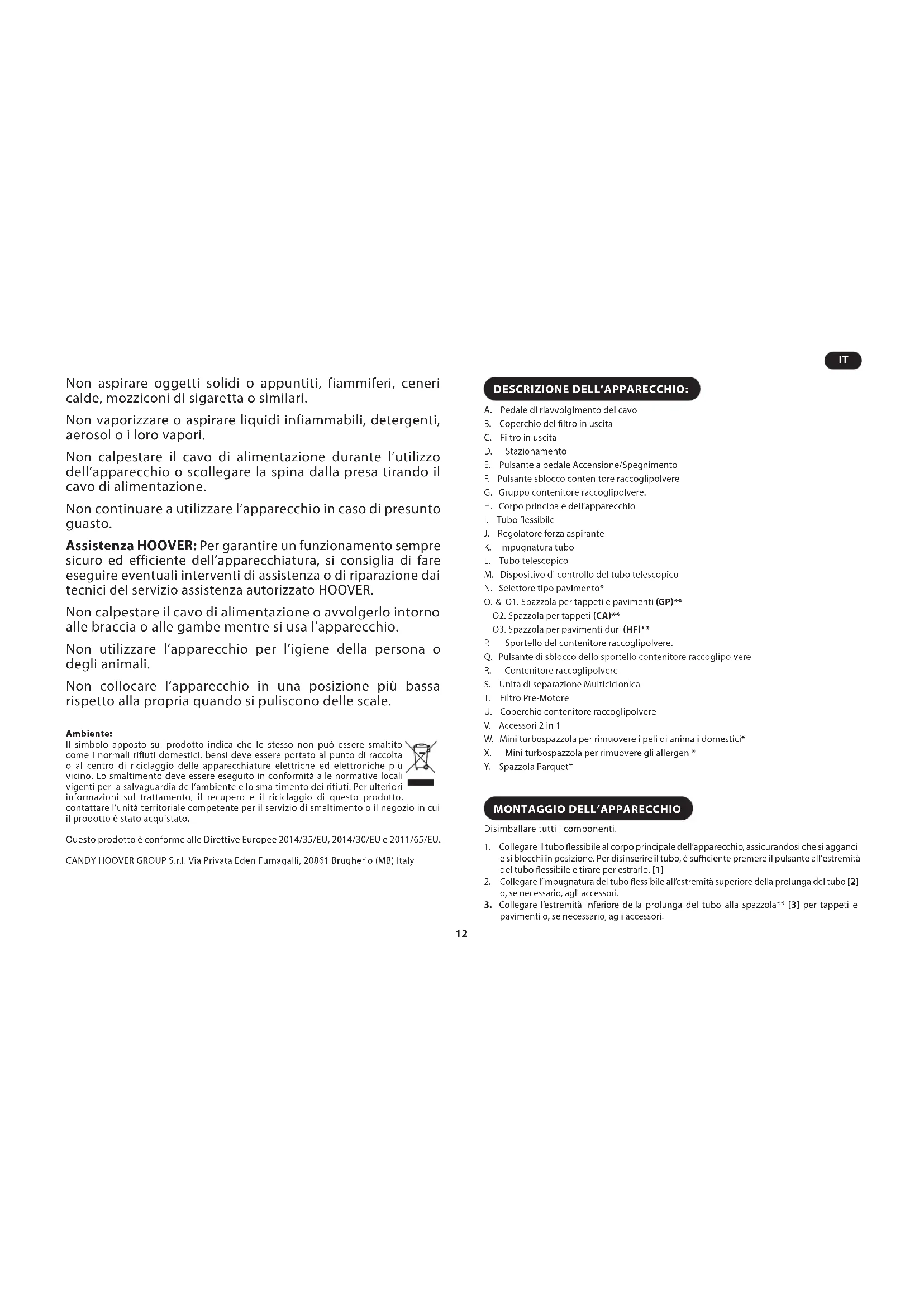 Questo apparecchio deve essere utilizzato esclusivamente in ambito domestico per interventi di pulizia, secondo le istruzioni riportate nel presente documento. Accertarsi di aver compreso le istruzioni prima di mettere in funzione l’apparecchio. Non lasciare l’apparecchio collegato alla corrente. Prima di procedere alla pulizia dell’apparecchiatura o di effettuare qualsiasi operazione di manutenzione, spegnere sempre l’apparecchio e scollegare la spina. Questo elettrodomestico non è destinato a essere utilizzato da bambini di età inferiore a 8 anni e da persone dalle ridotte capacità fisiche, sensoriali o mentali, o senza esperienza a causa di una inadeguata informazione sull’uso in sicurezza dell’apparecchio e sui relativi pericoli. Controllare che i bambini non giochino con l’apparecchio.Pulizia e manutenzione non possono essere eseguite da bambini senza sorveglianza da parte di una persona responsabile. Se il cavo di alimentazione è danneggiato, interrompere immediatamente l’utilizzo dell’apparecchio. Per evitare pericoli, il cavo di alimentazione dovrà essere sostituito da un tecnico del servizio assistenza autorizzato HOOVER. Tenere le mani, i piedi, i capi di abbigliamento non attillati e i capelli lontani dalle spazzole rotanti. Utilizzare solo accessori o parti di consumo e di ricambio consigliati o forniti da HOOVER. Elettricità statica: Alcuni tappeti possono produrre un piccolo accumulo di elettricità statica. Le cariche di elettricità statica non sono pericolose per la salute. Non utilizzare l’apparecchio all’aperto, su superfici bagnate o per aspirare liquidi. ITNon aspirare oggetti solidi o appuntiti, fiammiferi, ceneri calde, mozziconi di sigaretta o similari. Non vaporizzare o aspirare liquidi infiammabili, detergenti, aerosol o i loro vapori. Non calpestare il cavo di alimentazione durante l’utilizzo dell’apparecchio o scollegare la spina dalla presa tirando il cavo di alimentazione. Non continuare a utilizzare l’apparecchio in caso di presunto guasto. Assistenza HOOVER: Per garantire un funzionamento sempre sicuro ed efficiente dell’apparecchiatura, si consiglia di fare eseguire eventuali interventi di assistenza o di riparazione dai tecnici del servizio assistenza autorizzato HOOVER. Non calpestare il cavo di alimentazione o avvolgerlo intorno alle braccia o alle gambe mentre si usa l’apparecchio. Non utilizzare l’apparecchio per l’igiene della persona o degli animali. Non collocare l’apparecchio in una posizione più bassa rispetto alla propria quando si puliscono delle scale. Ambiente: Il simbolo apposto sul prodotto indica che lo stesso non può essere smaltito come i normali rifiuti domestici, bensì deve essere portato al punto di raccolta o al centro di riciclaggio delle apparecchiature elettriche ed elettroniche più vicino. Lo smaltimento deve essere eseguito in conformità alle normative locali vigenti per la salvaguardia dell’ambiente e lo smaltimento dei rifiuti. Per ulteriori informazioni sul trattamento, il recupero e il riciclaggio di questo prodotto, contattare l’unità territoriale competente per il servizio di smaltimento o il negozio in cui il prodotto è stato acquistato. Questo prodotto è conforme alle Direttive Europee 2014/35/EU, 2014/30/EU e 2011/65/EU. CANDY HOOVER GROUP S.r.l. Via Privata Eden Fumagalli, 20861 Brugherio (MB) Italy DESCRIZIONE DELL’APPARECCHIO: