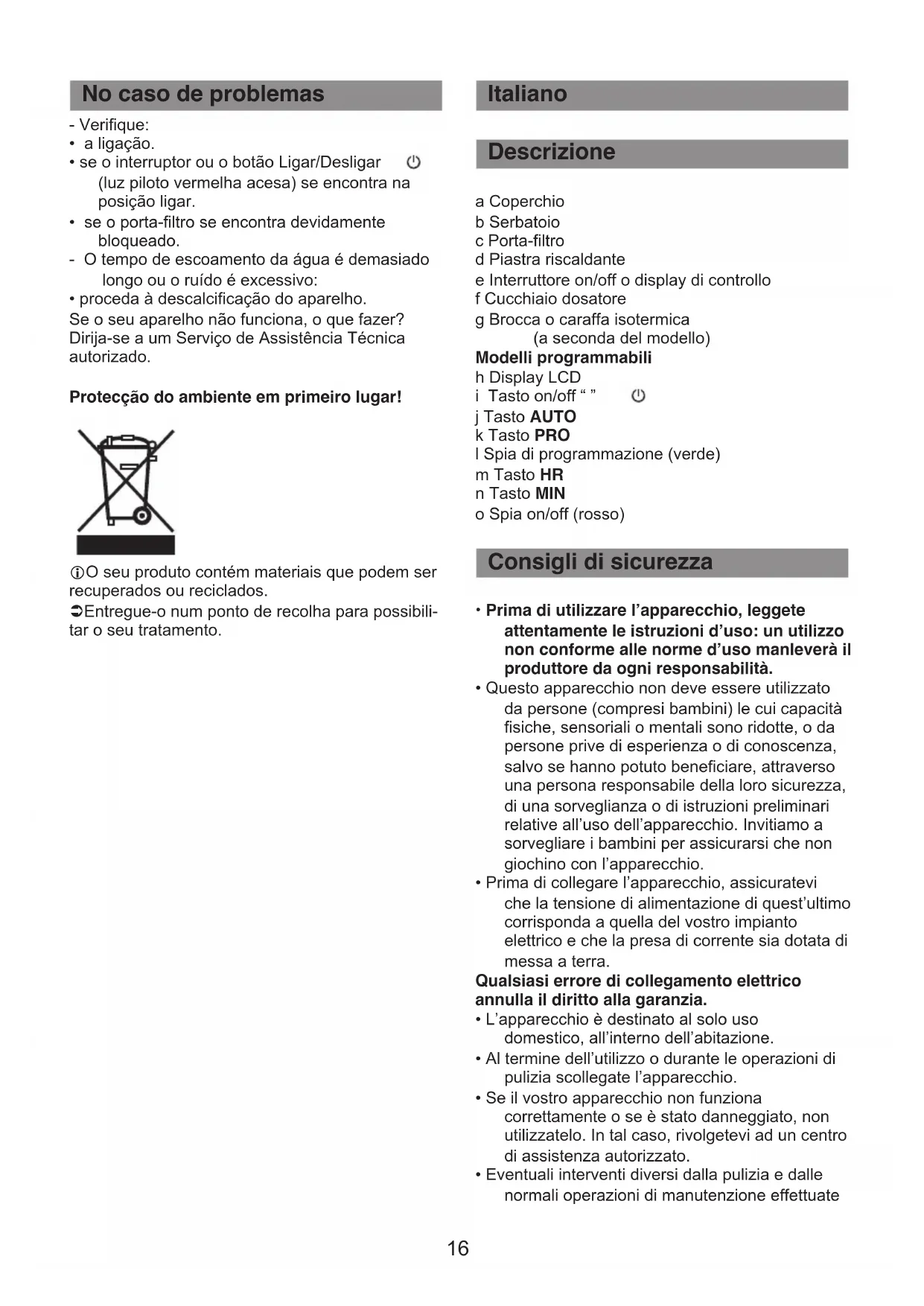 - decalcificate la vostra caffettiera. L’apparecchio continua a non funzionare? Rivolge- tevi a un centro assistenza autorizzato. Partecipiamo alla protezione dell’ambiente ! i Il vostro apparecchio è composto da diversi ma- teriali che possono essere riciclati. ‹ Lasciatelo in un punto di raccolta o presso un Centro Assistenza Autorizzato. Decalcificazione Accessori In caso di problemi Pulizia cafetière CM 823 EU11 :cafetière CM 823 16/11/10 11:17 Page1819 a Låg b Vandbeholder c Filterholder d Varmeplade e Tænd / sluk knap eller betjeningsdisplay f Måleske g Glaskande eller termokande (afhængig af model) Programmerbare modeller h LCD display i Tænd / sluk tast AUTO tast k PRO tast l Kontrollampe for programmering (grøn) m HR tast n MIN tast o Kontrollampe for tænd / sluk (rød)