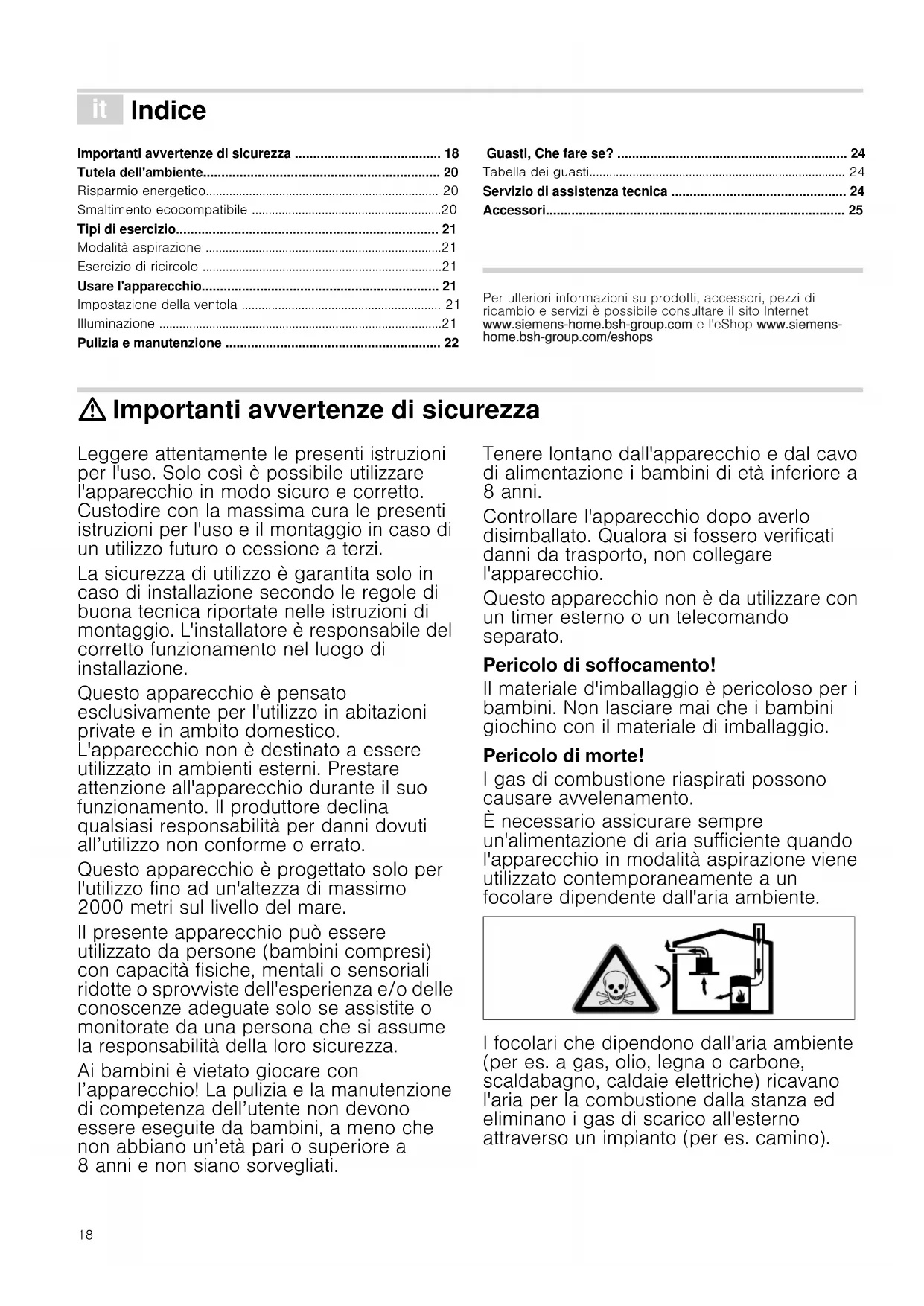 - Accessori Produktinfo Per ulteriori informazioni su prodotti, accessori, pezzi di ricambio e servizi è possibile consultare il sito Internet www.siemens-home.com e l'eShop www.siemens-eshop.com : Importanti avvertenze di sicurezza Leggere attentamente le presenti istruzioni per l'uso. Solo così è possibile utilizzare l'apparecchio in modo sicuro e corretto. Custodire con la massima cura le presenti istruzioni per l'uso e il montaggio in caso di un utilizzo futuro o cessione a terzi. La sicurezza di utilizzo è garantita solo in caso di installazione secondo le regole di buona tecnica riportate nelle istruzioni di montaggio. L'installatore è responsabile del corretto funzionamento nel luogo di installazione. Questo apparecchio è pensato esclusivamente per l'utilizzo in abitazioni private e in ambito domestico. L'apparecchio non è destinato a essere utilizzato in ambienti esterni. Prestare attenzione all'apparecchio durante il suo funzionamento. Il produttore declina qualsiasi responsabilità per danni dovuti all’utilizzo non conforme o errato. Questo apparecchio è progettato solo per l'utilizzo fino ad un'altezza di massimo 2000 metri sul livello del mare. Il presente apparecchio può essere utilizzato da persone (bambini compresi) con capacità fisiche, mentali o sensoriali ridotte o sprovviste dell'esperienza e/o delle conoscenze adeguate solo se assistite o monitorate da una persona che si assume la responsabilità della loro sicurezza. Ai bambini è vietato giocare con l’apparecchio! La pulizia e la manutenzione di competenza dell’utente non devono essere eseguite da bambini, a meno che non abbiano un’età pari o superiore a 8 anni e non siano sorvegliati. Tenere lontano dall'apparecchio e dal cavo di alimentazione i bambini di età inferiore a 8 anni. Controllare l'apparecchio dopo averlo disimballato. Qualora si fossero verificati danni da trasporto, non collegare l'apparecchio. Questo apparecchio non è da utilizzare con un timer esterno o un telecomando separato. Pericolo di soffocamento! Il materiale d'imballaggio è pericoloso per i bambini. Non lasciare mai che i bambini giochino con il materiale di imballaggio. Pericolo di morte! I gas di combustione riaspirati possono causare avvelenamento. È necessario assicurare sempre un'alimentazione di aria sufficiente quando l'apparecchio in modalità aspirazione viene utilizzato contemporaneamente a un focolare dipendente dall'aria ambiente. I focolari che dipendono dall'aria ambiente (per es. a gas, olio, legna o carbone, scaldabagno, caldaie elettriche) ricavano l'aria per la combustione dalla stanza ed eliminano i gas di scarico all'esterno attraverso un impianto (per es. camino). Per ulteriori informazioni su prodotti, accessori, pezzi di ricambio e servizi è possibile consultare il sito Internet www.siemens-home.bsh-group.com e l'eShop www.siemens- home.bsh-group.com/eshops19 In concomitanza della cappa accesa, dalla cucina e dalle stanze adiacenti viene sottratta dell'aria: senza un'alimentazione sufficiente di aria si crea depressione. I gas velenosi dal camino o dalla cappa di aspirazione vengono riaspirati nelle stanze. p. 25